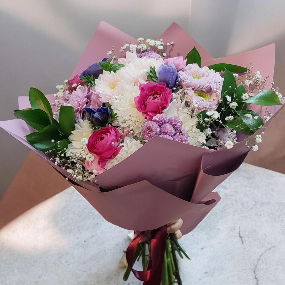 Anemone - 3 adet Ruskus - 3 adet ranunculus pink - 5 adet krizantem - 7 adet cipsofilya - 5 adet pon pon krizantem - 2 adet