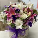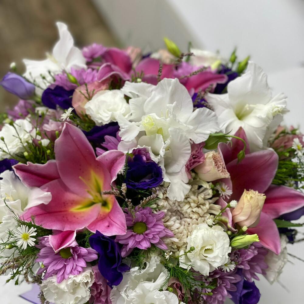 kutu içerisine hazırlanmış mevsim çiçekleri ve lilyumlar
