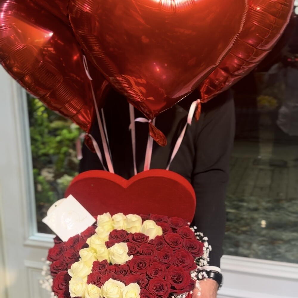 Bu özel kutuda tam 49 adet kırmızı gül ve 21 adet beyaz gül ile sevdiklerinize olan aşkınızı ve saygınızı gösterin. Hem romantik hem de zarif bir hediye olan bu kutuda çiçekler, herhangi bir özel gün için mükemmel bir seçimdir. Kutuyu daha da cazip hale getiren şey, içerisinde bulunan 5 adet helyum kırmızı kalp balon, sevdiklerinize duyduğunuz derin aşkı ve neşeyi sembolize ediyor. Bu muhteşem kutuda çiçeklerle, onlara ne kadar özel olduklarını hissettirin.