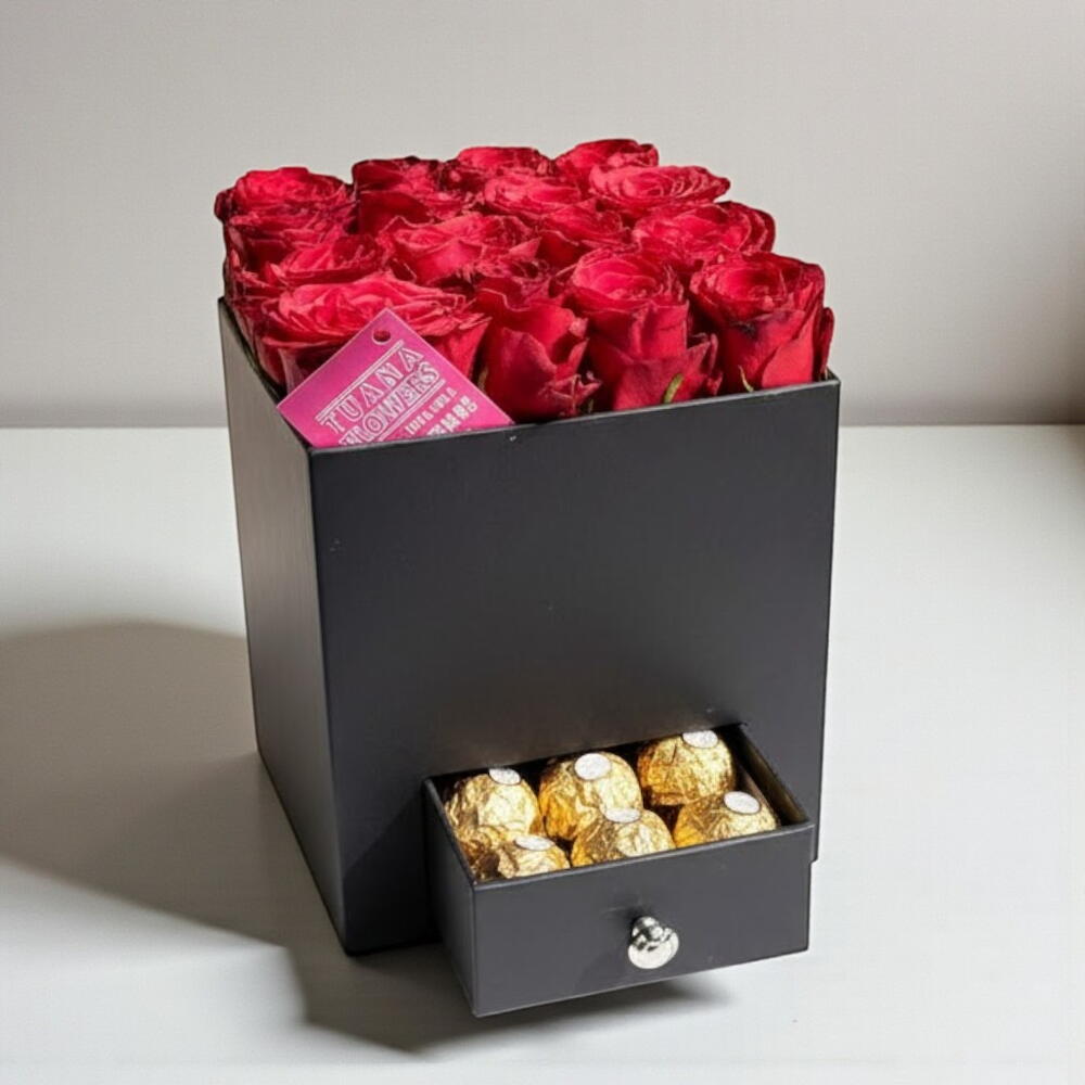 Romantik bir hediye arıyorsanız, bu kutuda çiçekler tam size göre! İçinde, son derece şık bir siyah kutuda sunulan 16 adet canlı kırmızı gül bulunur. Aşkınızı ve özel anılarınızı daha da tatlı hale getirecek 6 adet Roche çikolata ile kalbinin anahtarını elinize alacaksınız. Bu muhteşem ürün, sevdiklerinizi her zaman özel hissettirecek bir seçenek olacak! Buketin uzun süre taze kalması için düzenli olarak suyu değiştirmeyi unutmayın ve doğrudan güneş ışığından uzak tutun. Hem estetik hem de işlevsel olan bu hediye, her yaştan kişinin beğenisini kazanacak.
