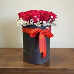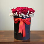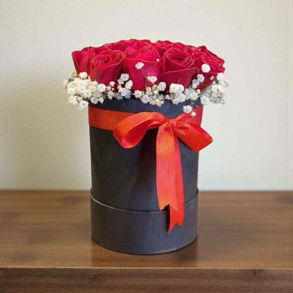 Bu şık tasarım, derin kırmızı güllerin büyüleyici ihtişamını zarif siyah kutu ve canlı kırmızı kurdele ile buluşturuyor. Kutu içi düzenlemede kullanılan beyaz cipso çiçekleri, kırmızı güllerin romantik dokusunu daha da ön plana çıkararak göz alıcı bir kontrast yaratıyor. Minimalist ama son derece etkileyici görünümüyle sevgililer günü, yıldönümü, doğum günü veya özel bir teşekkür için mükemmel bir seçimdir. Masanızın, komodinin ya da çalışma alanınızın dekorasyonunu anında şıklaştırır. Çiçeklerin daha uzun süre taze kalması için kutu içindeki süngerin her iki günde bir az miktarda suyla nemlendirilmesi yeterlidir. Direkt güneş ışığından uzak, serin bir ortamda muhafaza edildiğinde güller canlılığını daha uzun korur.
