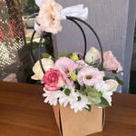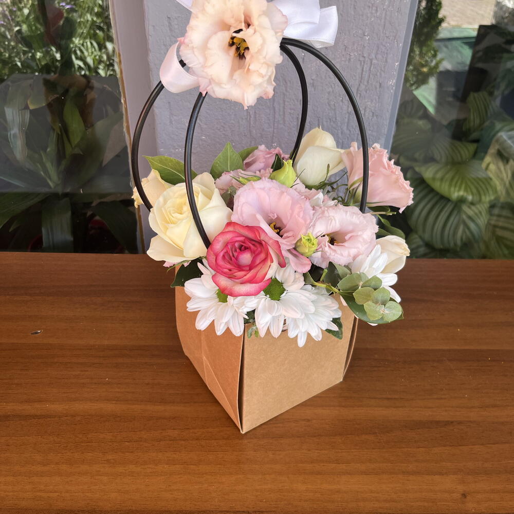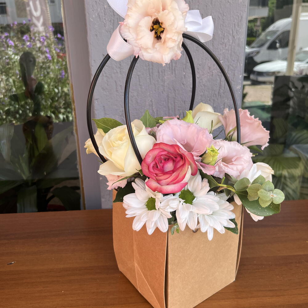 kutu - 1 adet beyaz gül - 2 adet yeşil yapraklar - 5 adet papatya beyaz - 10 adet lisyantus pembe - 8 adet gül pembe - 1 adet
