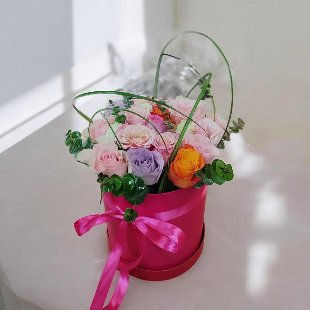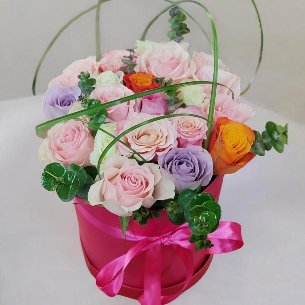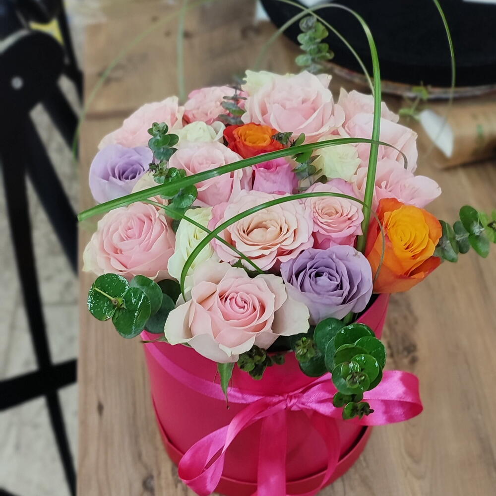 okaliptüs - 5 adet renkli ithal güller - 21 adet dekoratif yaprak - 5 adet