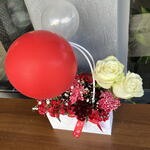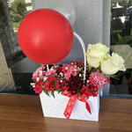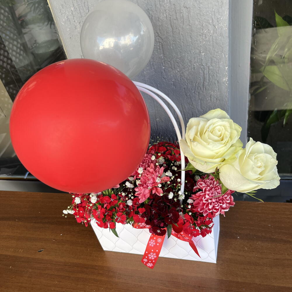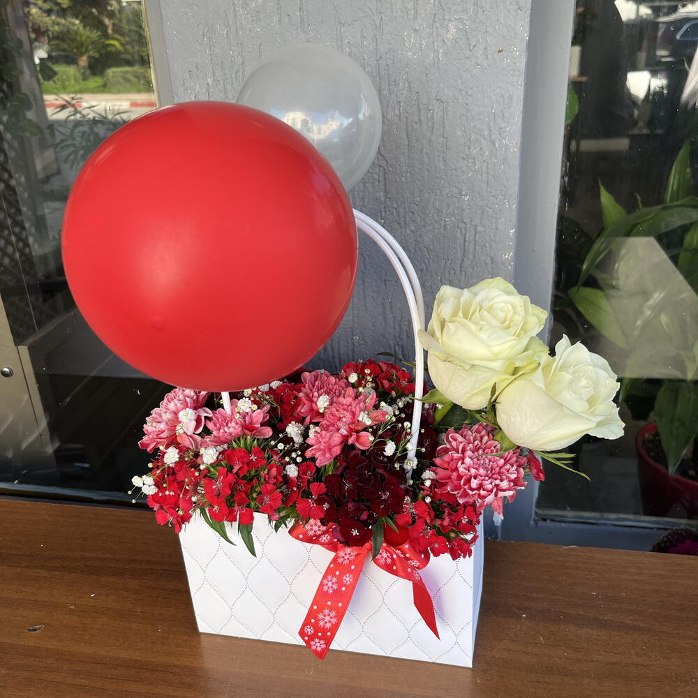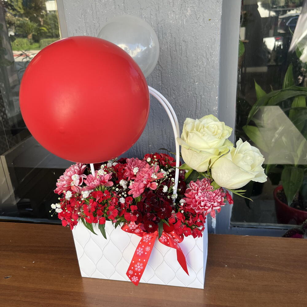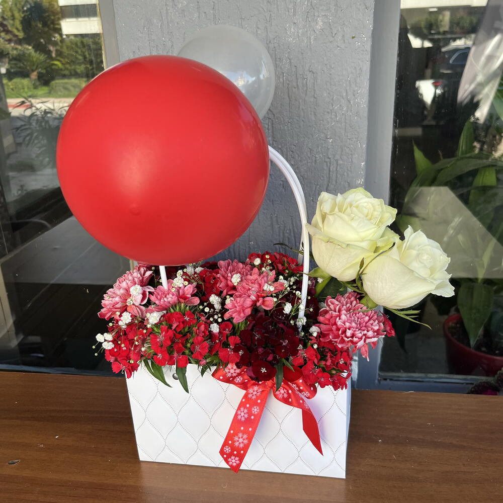 beyaz gül - 2 adet hüsnüyusuf çiçeği - 10 adet balon - 2 adet çanta - 1 adet kasımpatı kırmızı - 5 adet