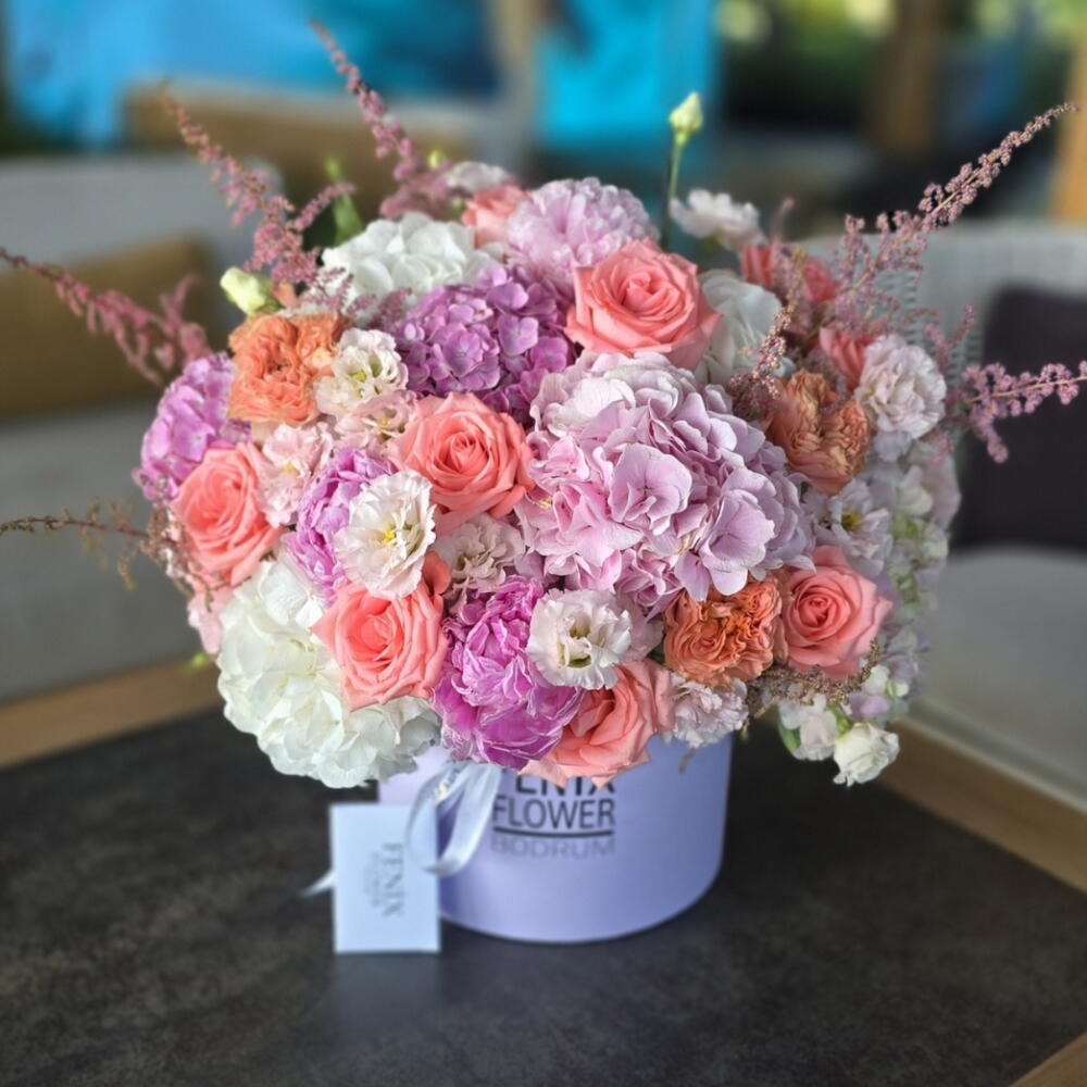 Eustoma - 31 adet Peony - 9 adet rosa - 21 adet garnitür yeşillik - 11 adet hydrenga - 9 adet