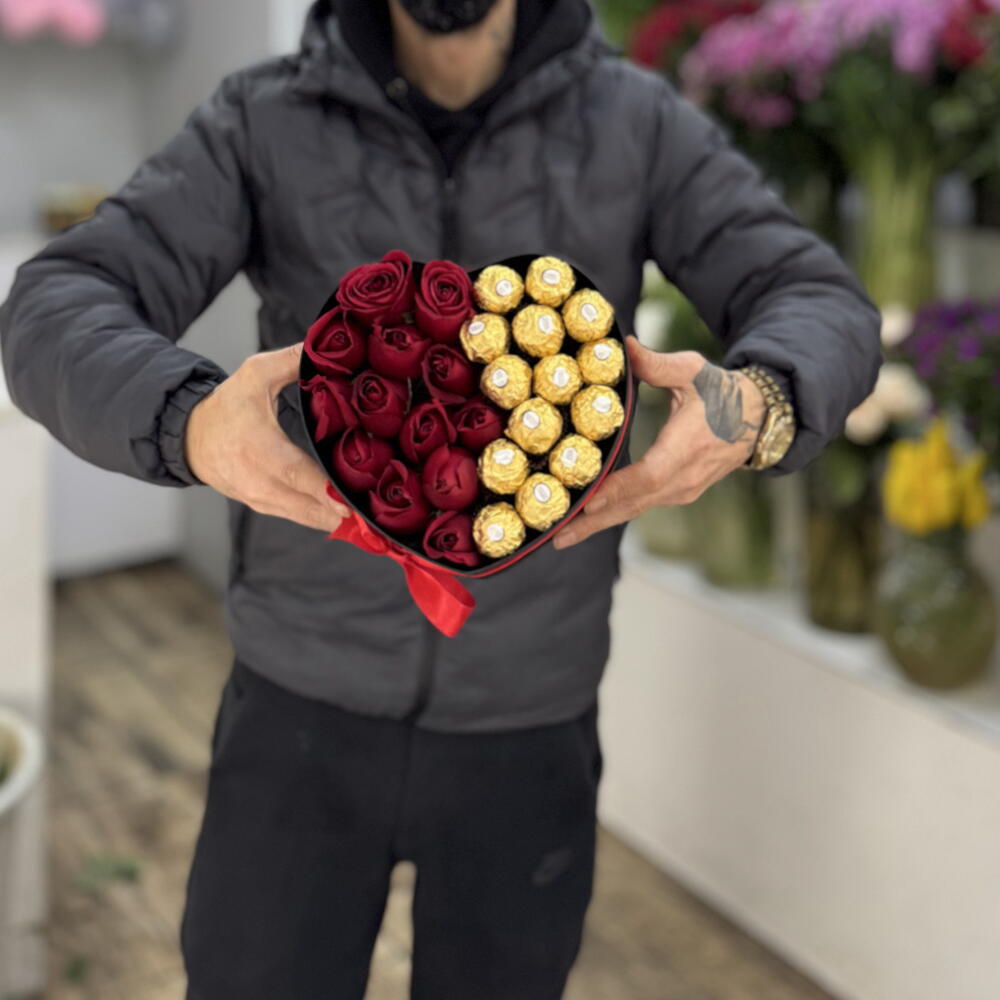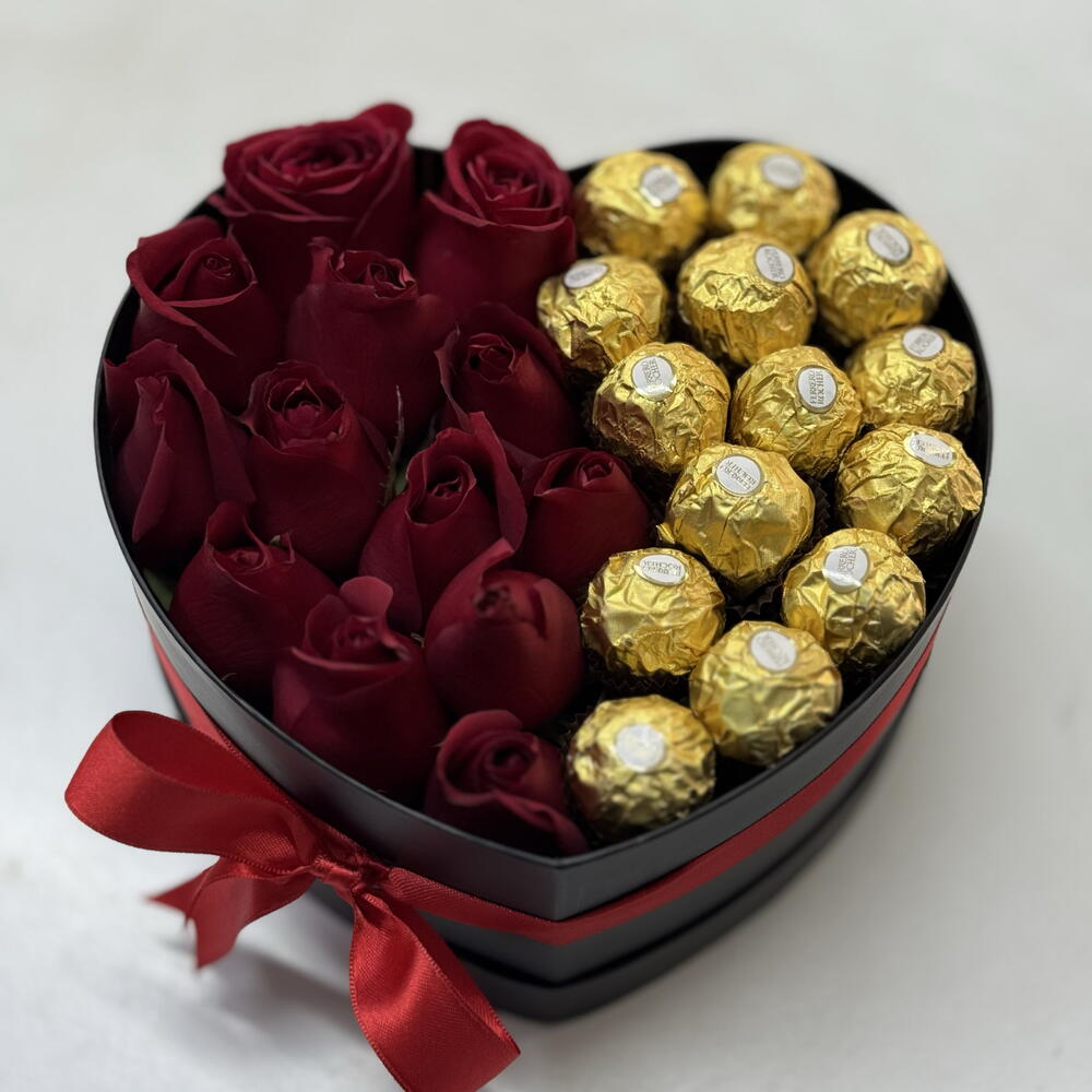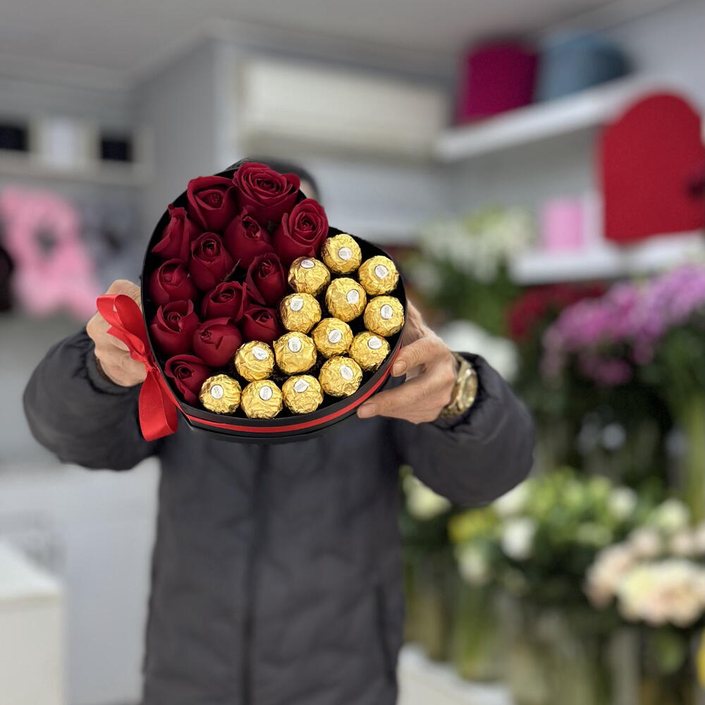 Bu muhteşem Kutuda Çiçek hediye seti, romantizmin ve tatlı tadın mükemmel birleşimini sunuyor. 16 adet yüksek kaliteli Ferrero Rocher çikolatası ile birlikte gelen bu kutu, tatlı dişiniz için idealdir. Bunlara ek olarak, 16 adet taze ve göz alıcı kırmızı gül ile aşkınızı göstermenin en güzel yolu. Üstelik hepsi 1 adet kalp şeklinde zarif ve şık bir kadife kutuda sunuluyor. Bu tatlı ve romantik kutu ile sevdiklerinizi şımartın!