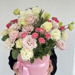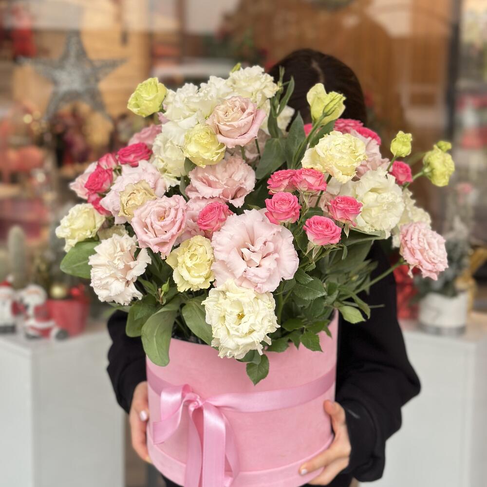 kurdale - 1 adet pembe sprey gül - 5 adet lisiantus pink - 10 adet pembe renk kutu (22-25 cm) - 1 adet lisiantus beyaz - 10 adet