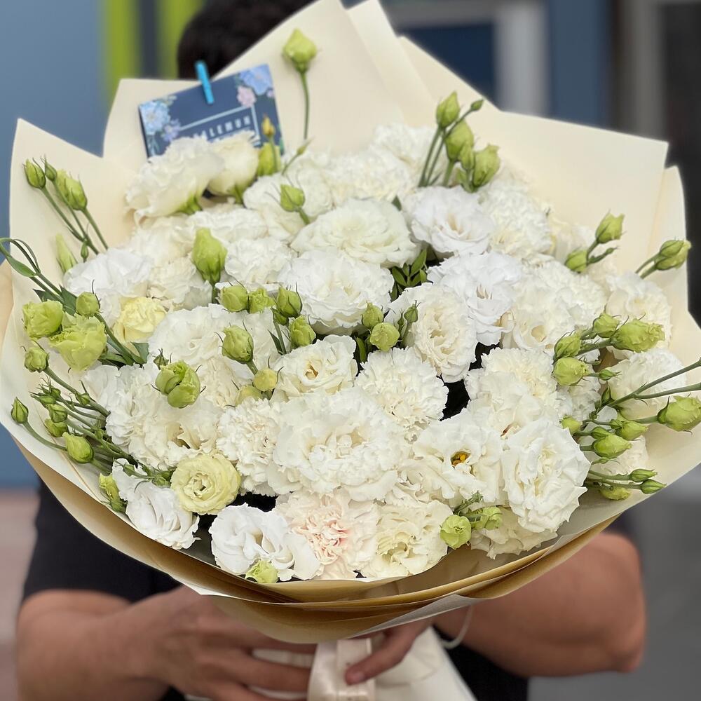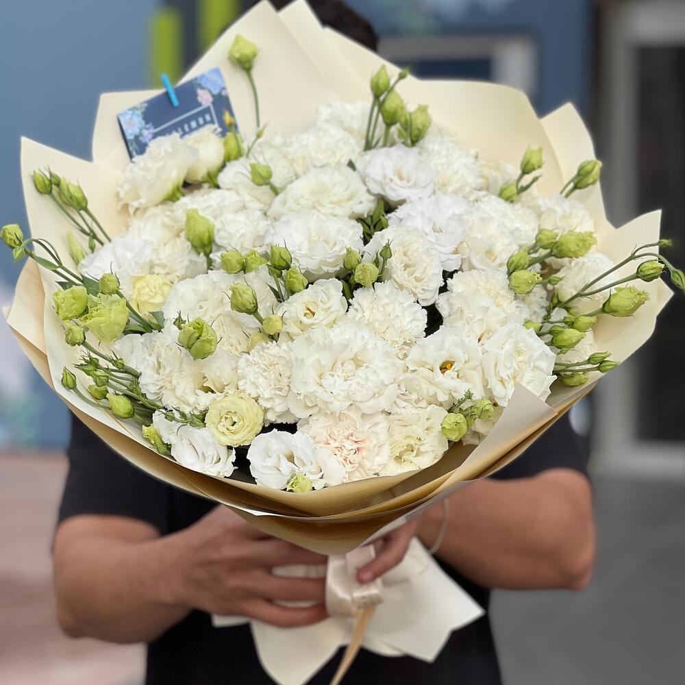 Eustoma ve dianthus mix buketi. Buket beyaz severler çiçek severler için hem butik hemde dolgun.