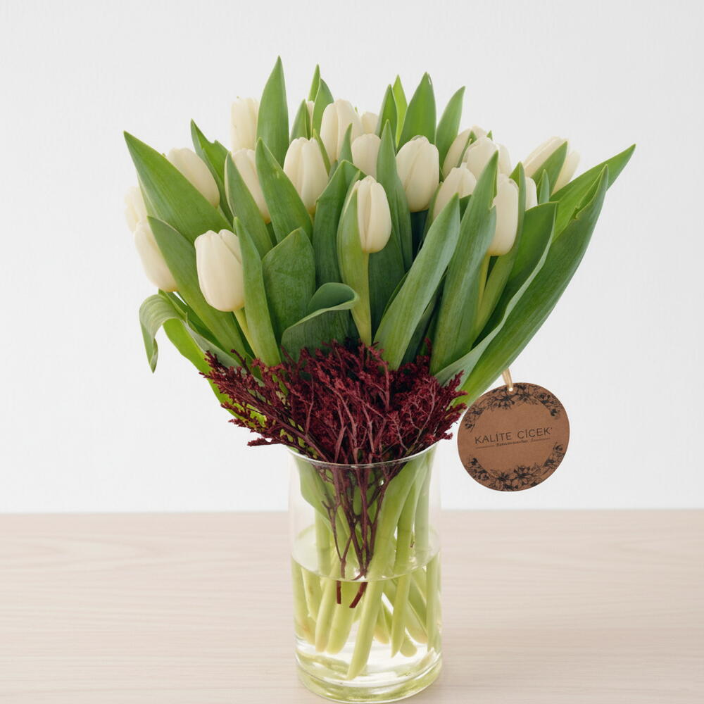 Zarafetin ve sadeliğin simgesi olan beyaz laleler, cam vazo içerisinde şık bir sunumla karşınızda. Taptaze yeşil yaprakları ve bordo kuru çiçek detaylarıyla bu aranjman, her ortama huzur ve şıklık katıyor. Sevdiklerinize dinginlik ve zarafet dolu bir hediye vermek istiyorsanız, bu buket tam size göre. Özellikle doğum günü, yeni iş tebriği ya da içten bir teşekkür için ideal bir seçimdir. Cam vazosu sayesinde uzun süre tazeliğini korur ve göz alıcı duruşunu kaybetmez. Her bir lale özenle seçilerek hazırlanmış, sadeliğin içindeki ihtişamı yansıtıyor. Bu özel aranjmanla zarafetin dilini konuşun.