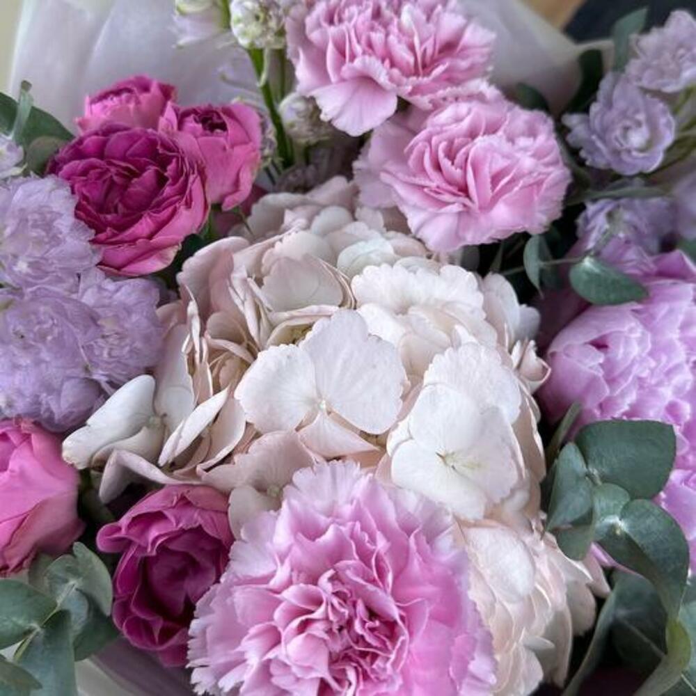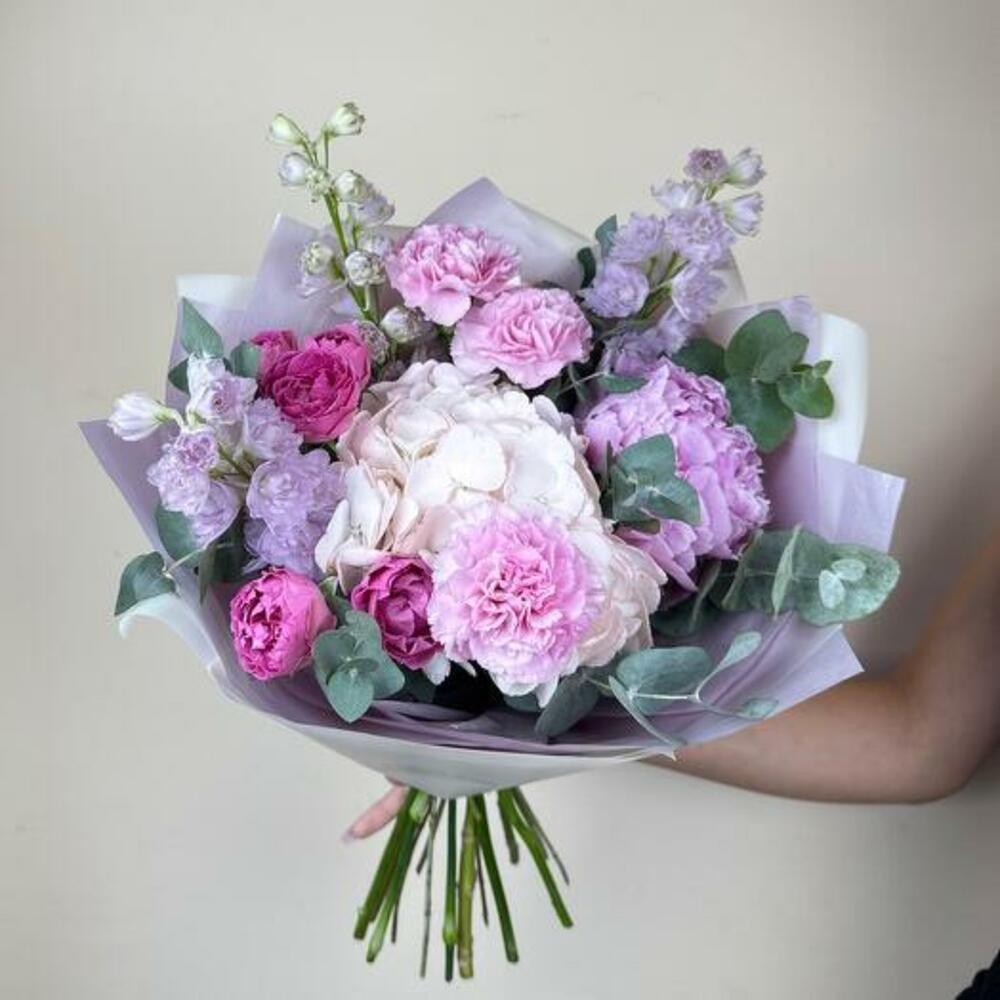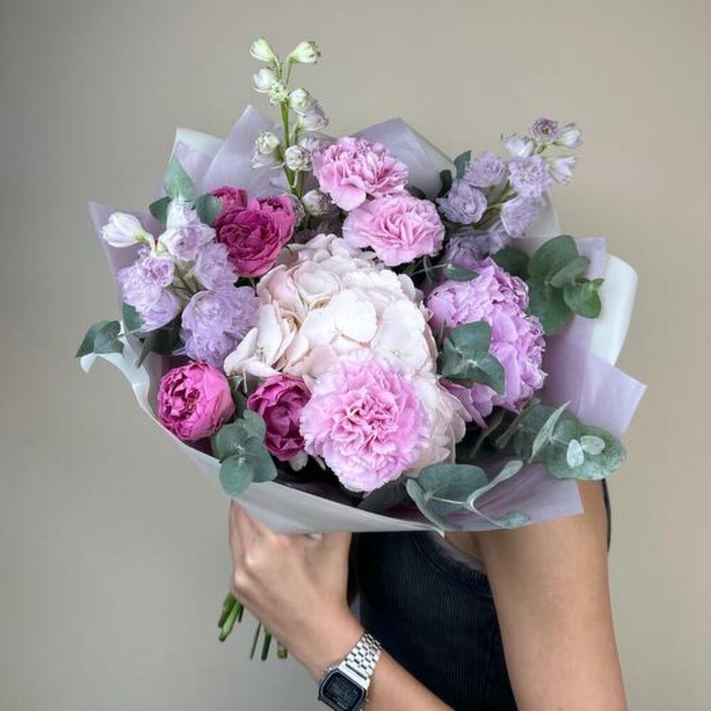 Lavanta Buketimizin huzur veren güzelliğine kendinizi bırakın. Bu büyüleyici aranjman, pembe ve lavanta tonlarının uyumlu bir karışımında sergilenen yemyeşil ortanca, zarif delphiniumlar ve romantik şakayık içerir. Narin karanfillerin ve büyüleyici sprey güllerin eklenmesi buketin derinliğini ve sofistikeliğini artırır. Herhangi bir özel gün için veya sadece birinin gününü aydınlatmak için mükemmel olan bu buket, zarafet ve dinginliğin özünü yakalayarak içten duyguları iletmek için çarpıcı bir seçimdir.
