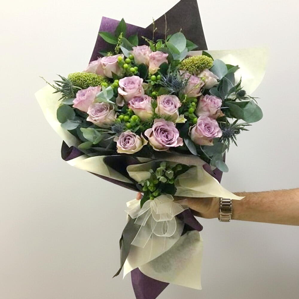 Bu çarpıcı çiçek buketi, güzelliği ve fazlalığı ile büyüler. Lila güllerin (23 adet) büyülü ve romantik enerjisi, okaliptusların (5 adet) canlı yeşili ve yeşil hprekumların (3 adet) benzersiz dokusuyla birleşiyor. İçten gelen bir hediye veya unutulmaz bir süs için mükemmel olan bu buket, herhangi bir odaya yaşam ve renk katacaktır.
