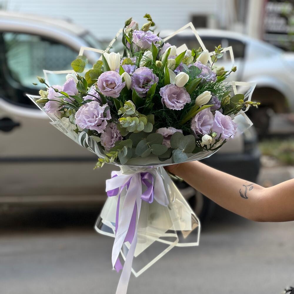 Bu muhteşem çiçek buketi, 5 adet zarif lale ve 30 adet canlı lisyantus ile oluşturulmuştur. Bu çiçekler özenle seçilmiş ve bir araya getirilmiştir, zengin renk ve doku contrastı sağlarlar. Her biri kendi güzelliği ile öne çıkan çiçekler, birlikte hem sofistikasyon hem de doğallığı yansıtır. Bu çiçek buketi, her türlü özel anı kutlamak veya sevdiklerinize ne kadar değer verdiğinizi göstermek için mükemmel bir seçenektir.