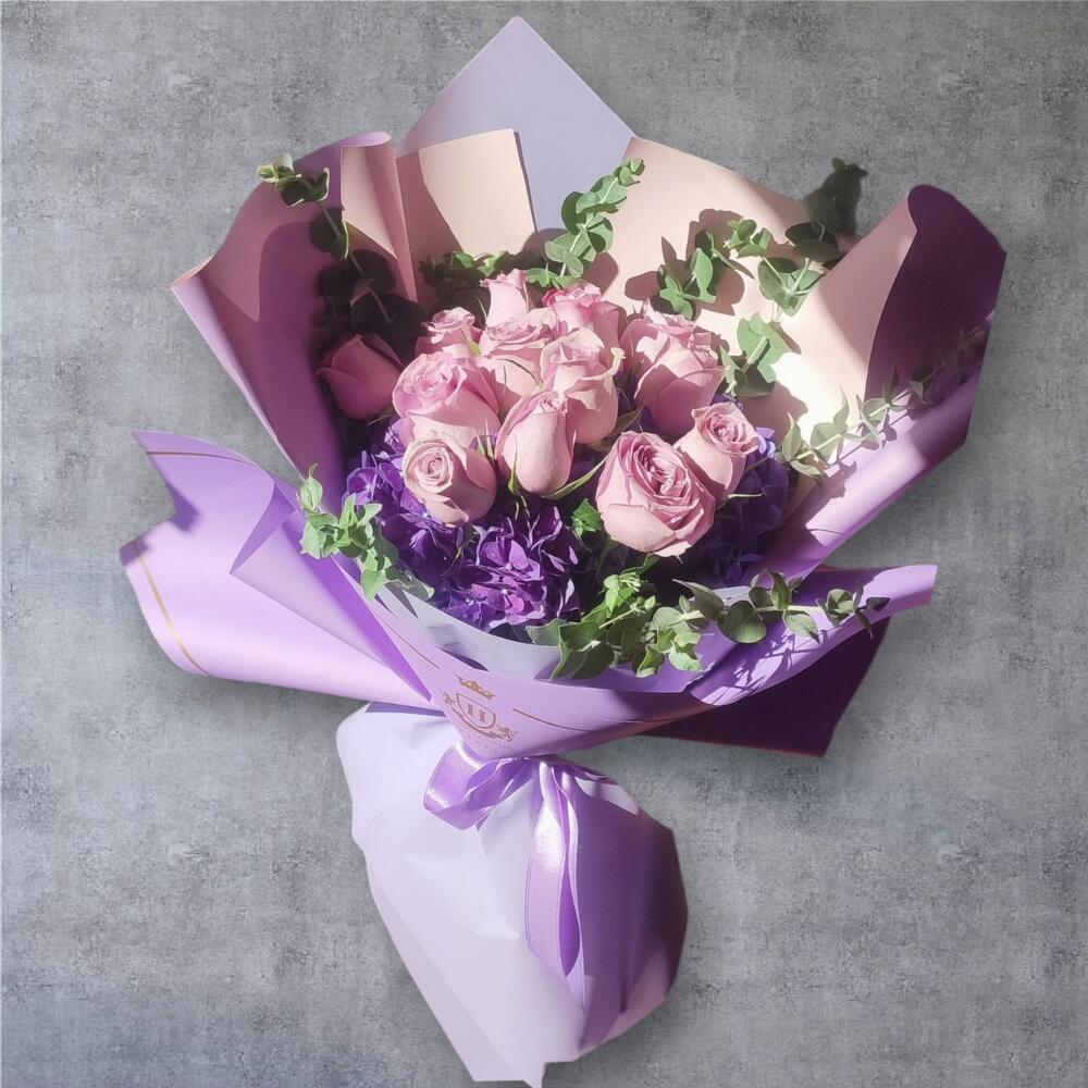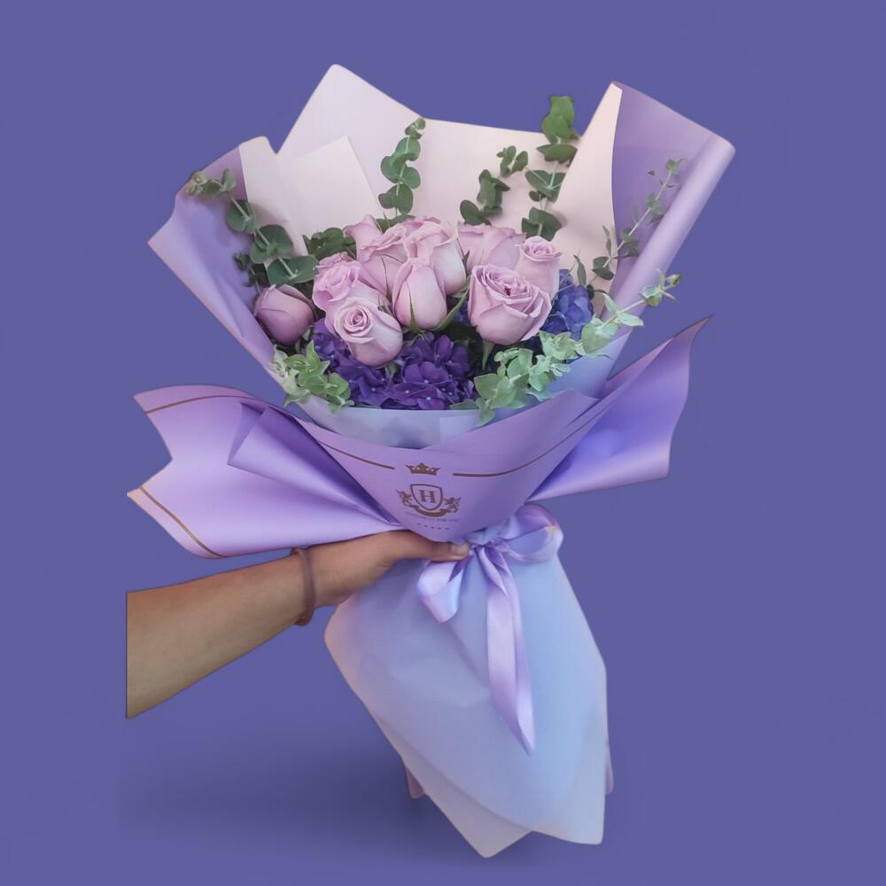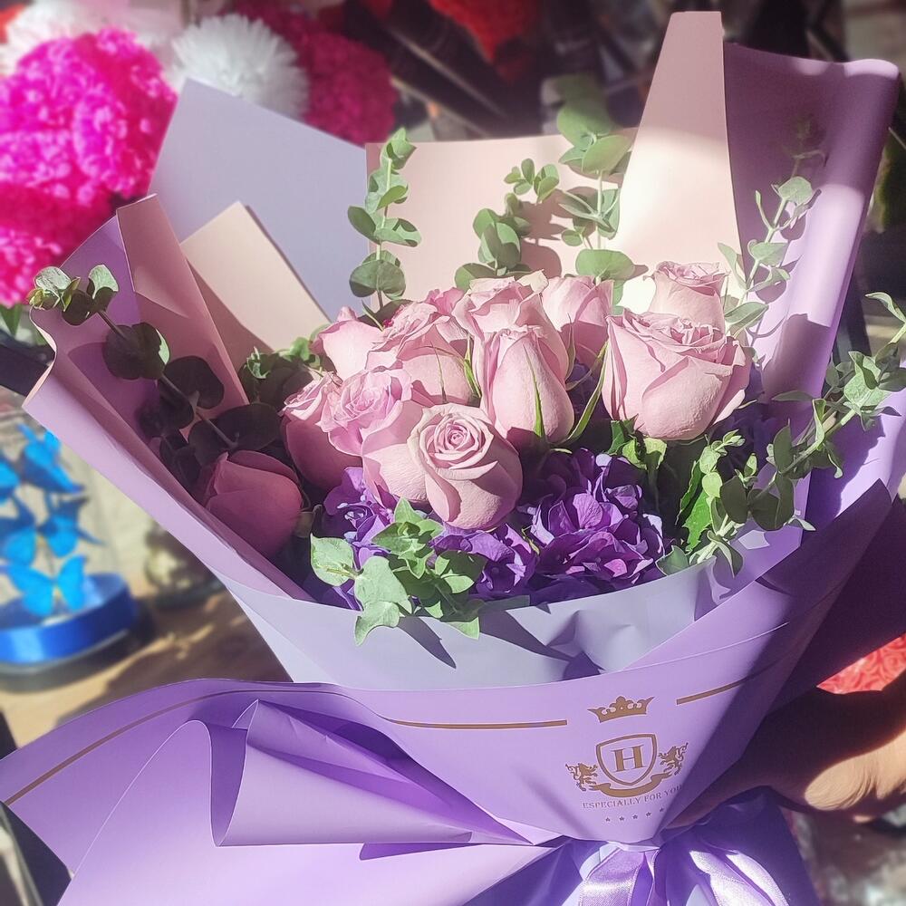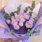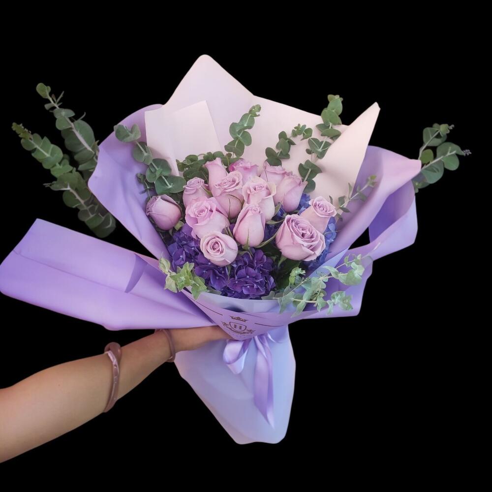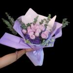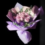 mor krizantem - 1 adet okaliptüs dalı - 5 adet lila gül ithal - 13 adet