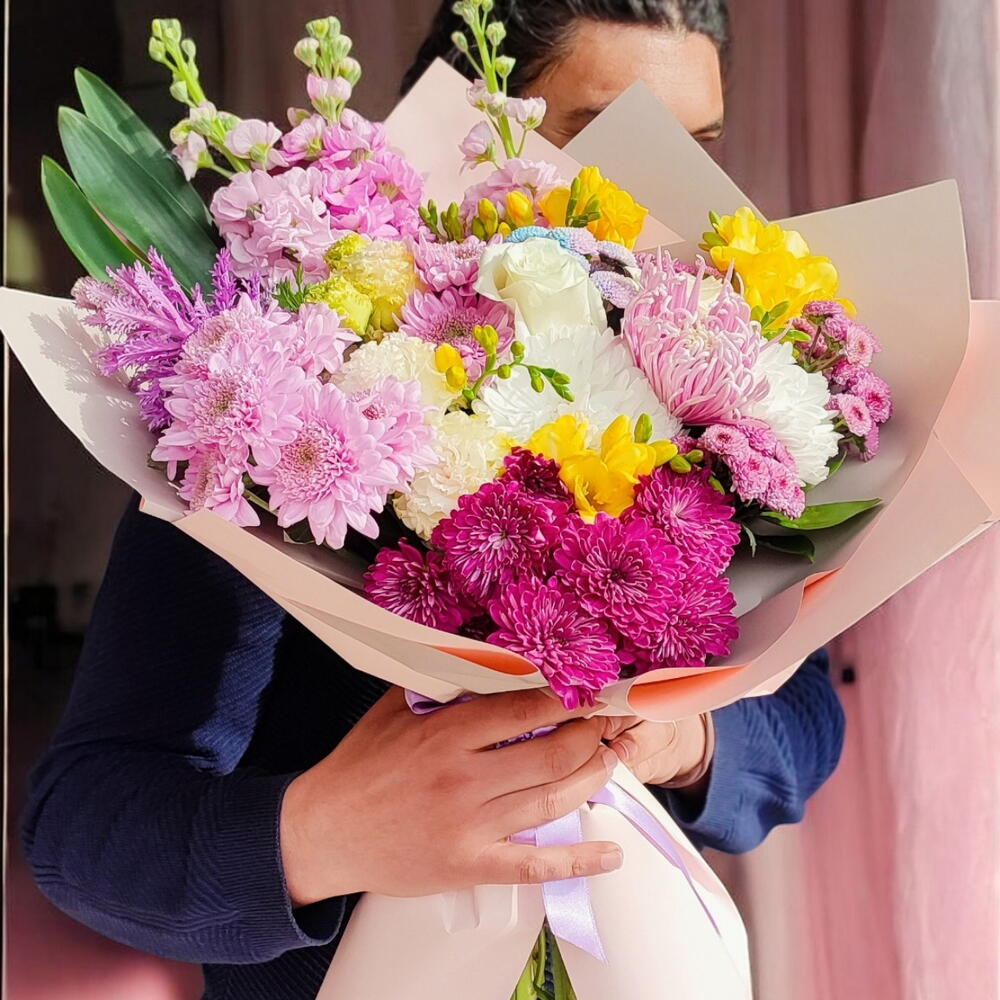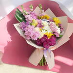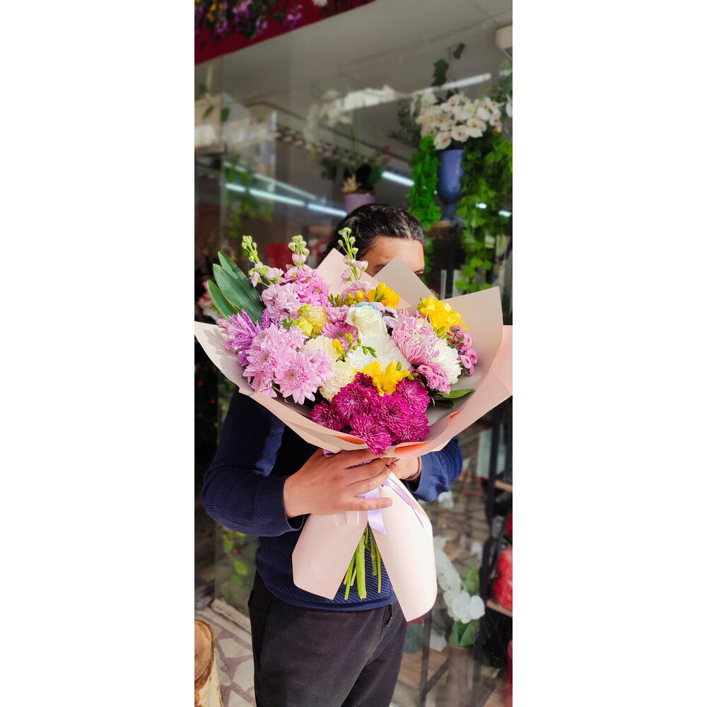 şebboy - 3 adet frezya sarı - 3 adet krizantem beyaz - 3 adet yeşil yaprak süslemeleri - 3 adet krizantem lila - 5 adet krizantem ponpon - 3 adet
