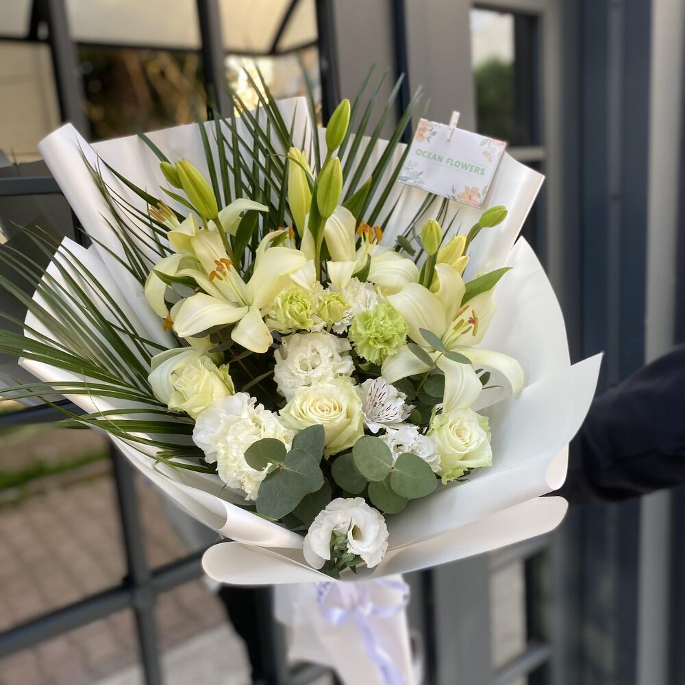 Lilium - 3 adet gül - 6 adet okaliptüs - 5 adet karanfil - 5 adet fenix yaprak - 3 adet lisyantus - 5 adet