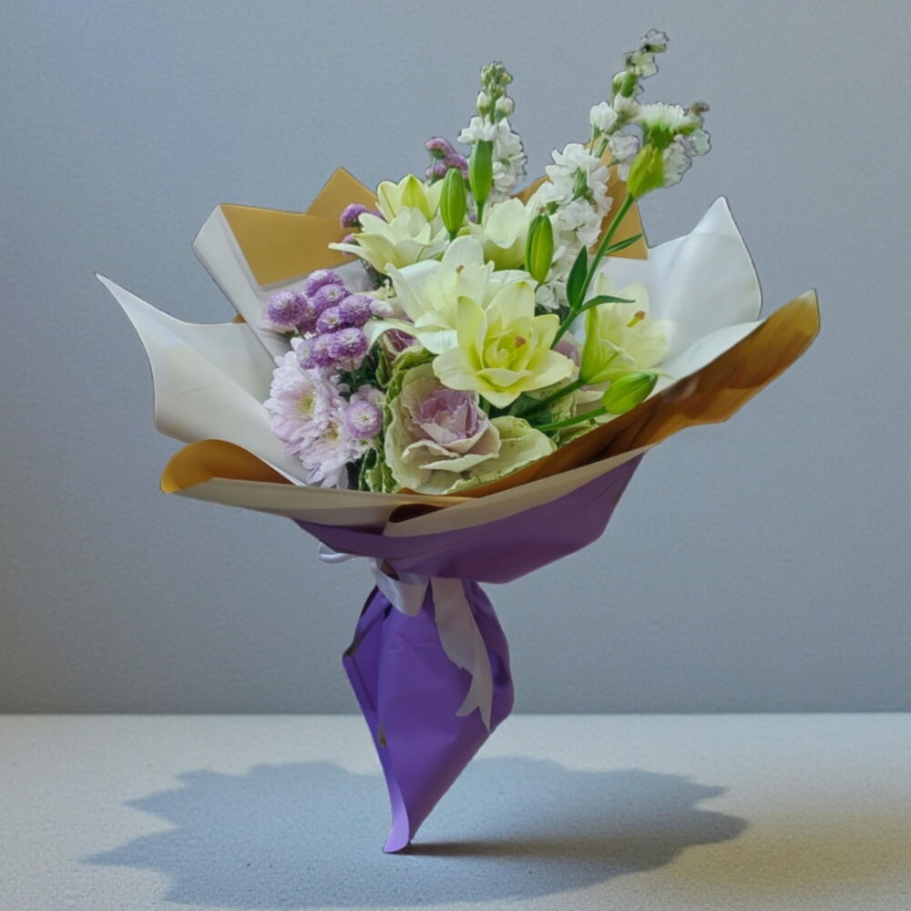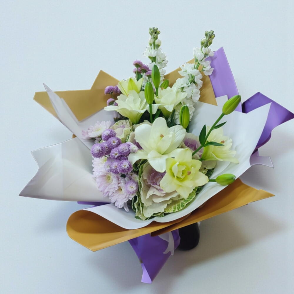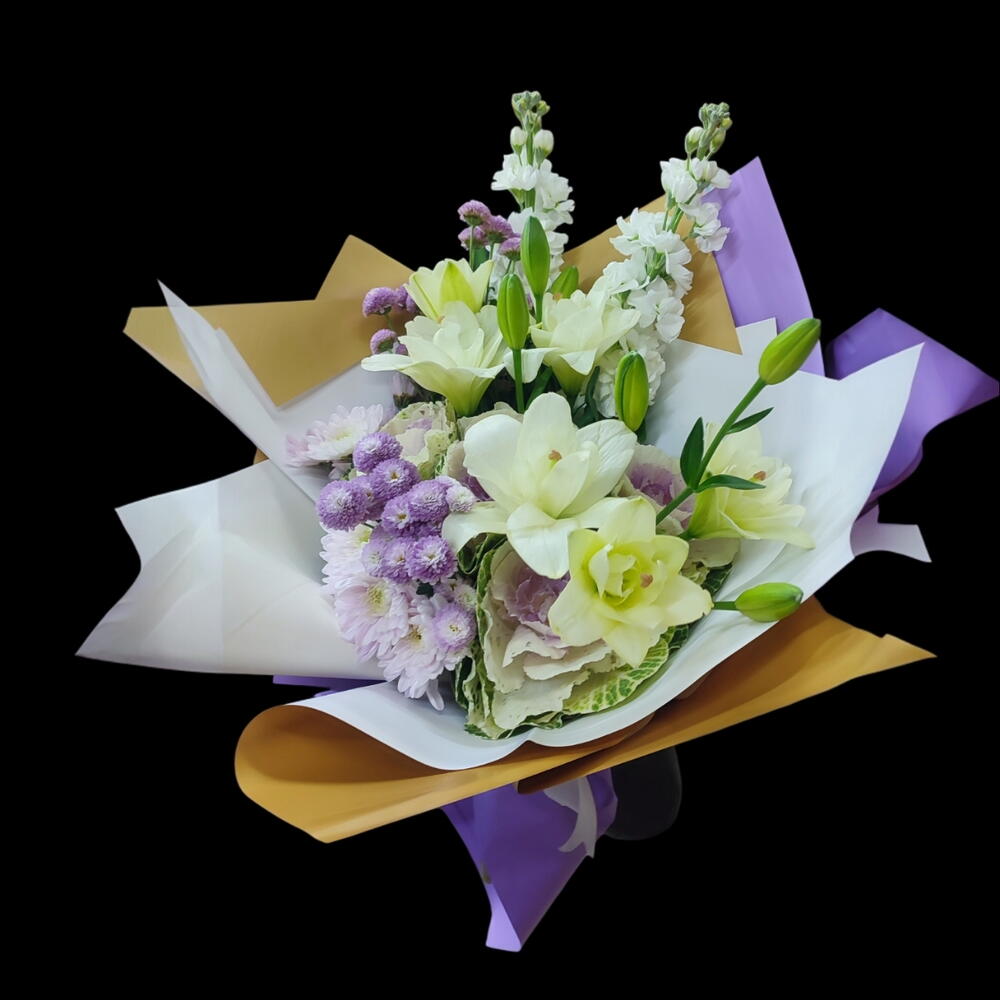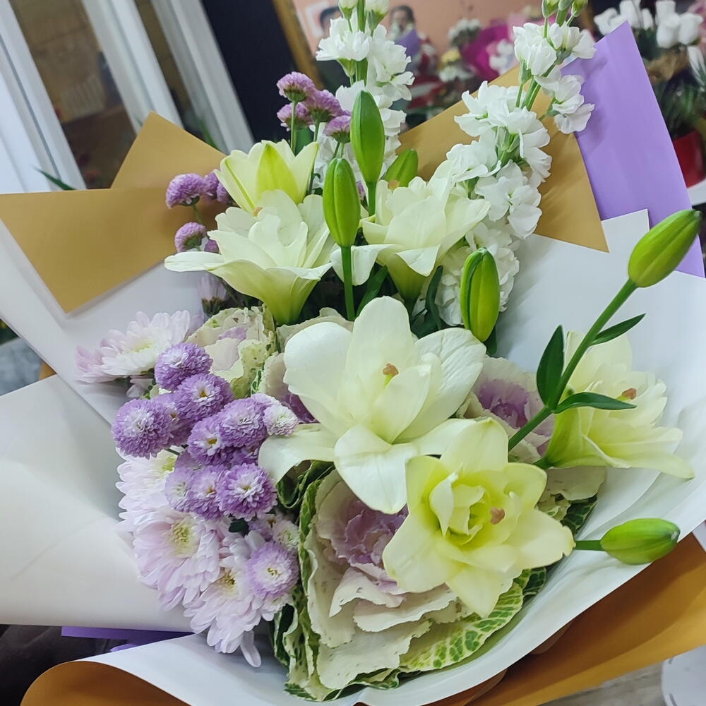 süs lahanası - 3 adet şebboy beyaz - 2 adet kasimpati - 3 adet katmerli lilyum - 5 adet krizantem mini - 5 adet