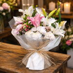 Bu çiçek buketi, hem göz alıcı hem de mis kokulu çeşitlerden oluşan bir kombinasyonla tasarlanmıştır. İçerisinde 6 adet beyaz lilyum kandili, zarif ve romantik bir hava katması için 3 adet pembe lilyum kandili bulunmaktadır. Ayrıca buketin içine dikkat çekici bir güzellik katmak için 3 adet beyaz gül ve canlılık katmak için 3 adet pembe gül eklenmiştir. Son dokunuş olarak ise, buketi tamamlamak için 3 adet anastasia çiçeği eklenmiştir. Bu çiçek buketi, sevdiklerinize ne kadar özel olduklarını hissettirmek için mükemmel bir seçim olacaktır.