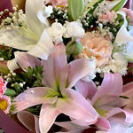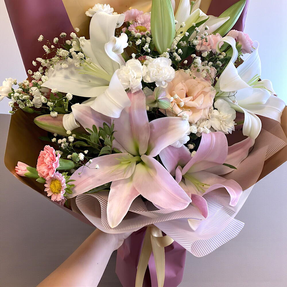 pembe lilyum - 1 adet pembe gül - 1 adet beyaz lilyum - 1 adet papatya - 3 adet pembe ada karanfili - 5 adet