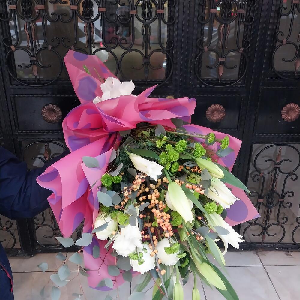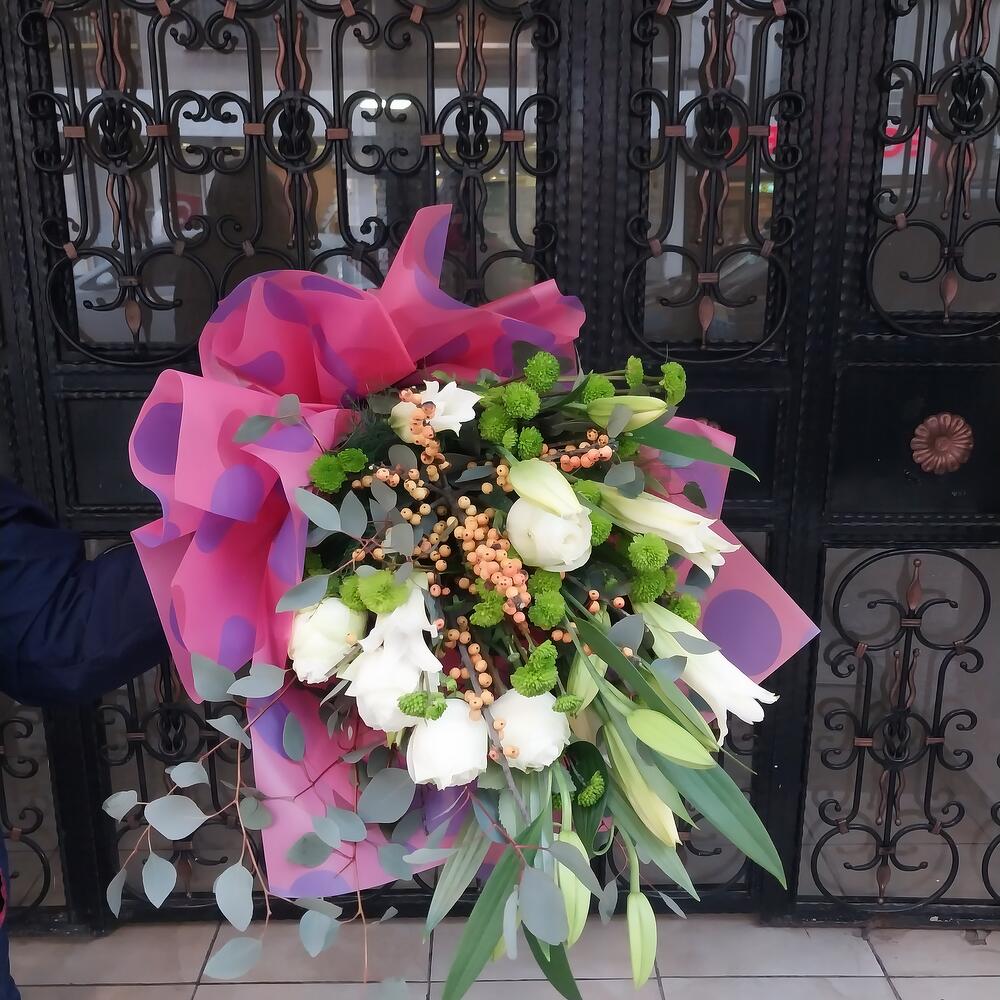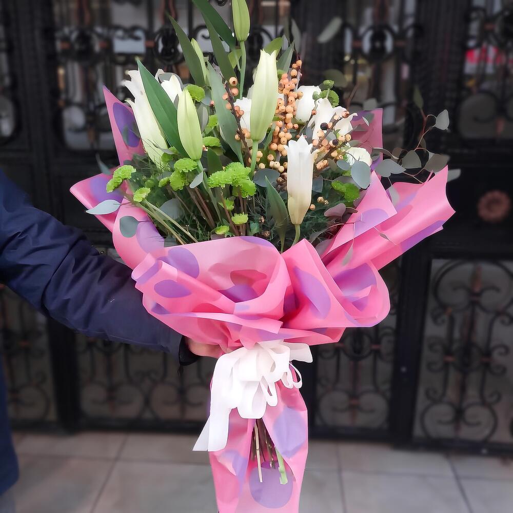 Bu çarpıcı çiçek buketi; 3 adet zarif lilyum, 5 adet beyaz gül, 5 adet yeşil krizantem ve 3 adet kokulu okaliptus ile titizlikle hazırlanmıştır. Bu çiçek aranjmanı, her tür özel gün için mükemmel bir seçim olacak. Evinizde veya ofisinizde sofistike bir dokunuş yaratmak için bu muhteşem çiçek buketini hediye olarak verebilir ya da kendiniz için satın alabilirsiniz.