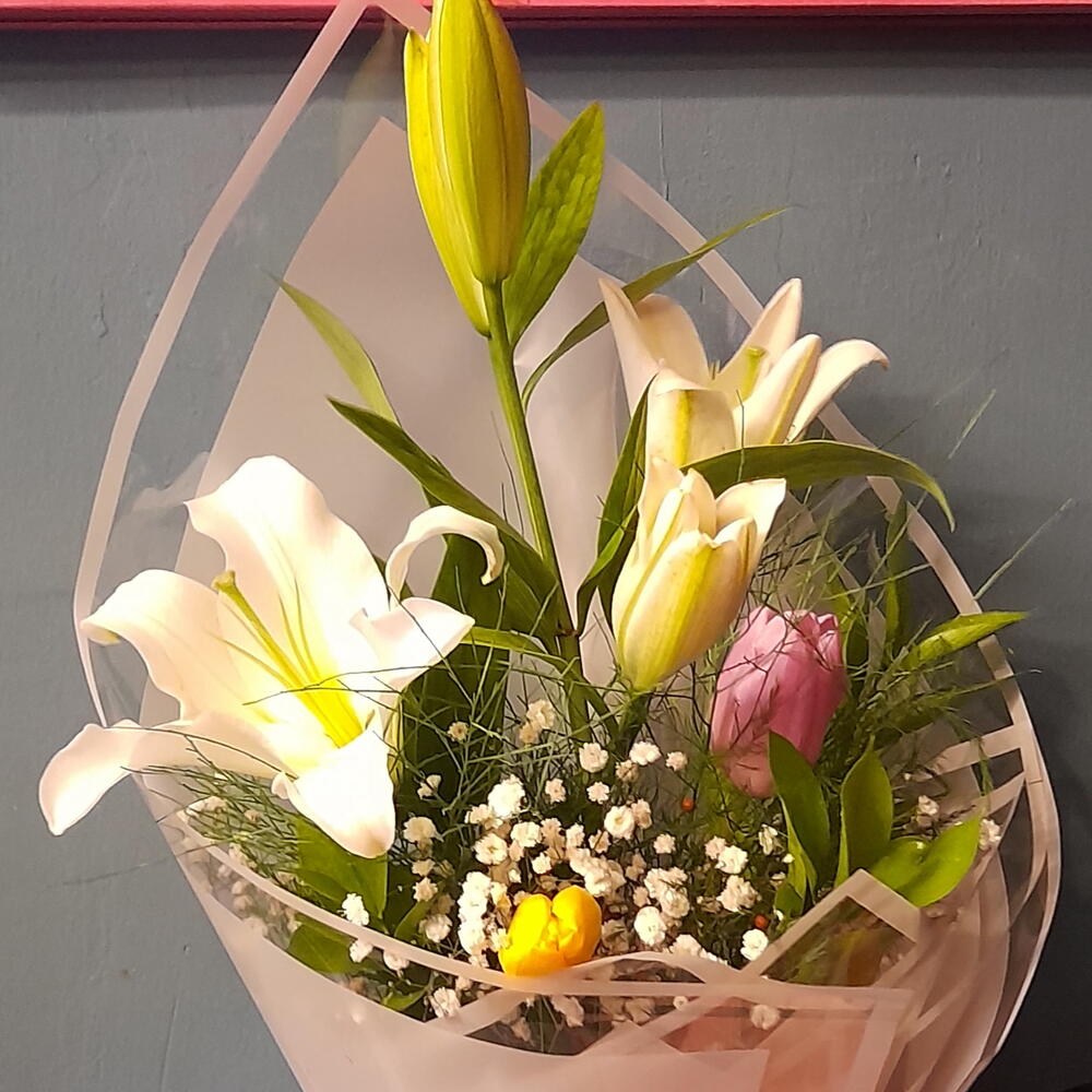 Saflığın zarafetiyle beyaz lilyum, neşenin sıcak dokunuşuyla sarı lale ve romantizmin en narin haliyle pembe lale… Üç dal cipsofilia ve özenle seçilmiş yeşilliklerle tamamlanan bu özel buket; duygularınızı sade ama unutulmaz bir şıklıkla anlatmak için hazırlandı.