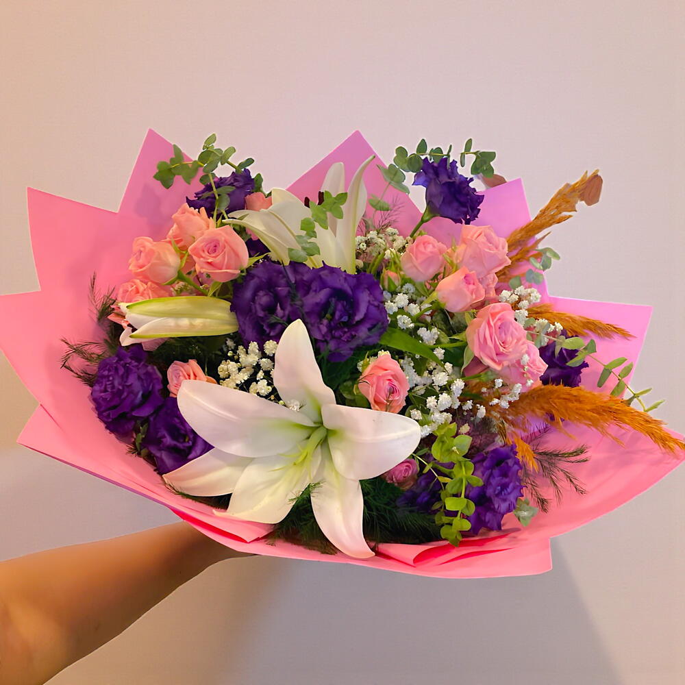 mor lisyantus - 10 adet pembe çardak gül - 2 adet beyaz lilyum kandili - 3 adet