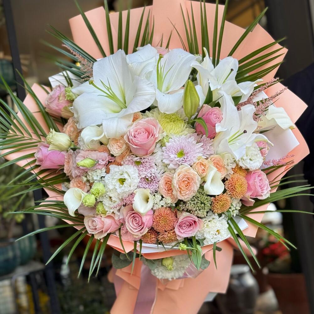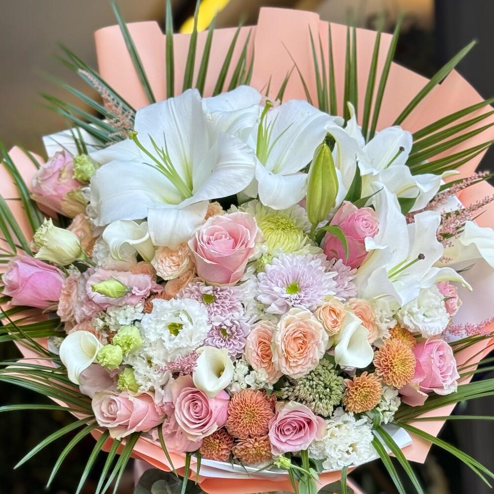 🌸 Zarafetin En Güzel Hali 🌸 Beyaz zambakların asil duruşu, pembe ve somon güllerin romantik dokunuşu, şık krizantemler ve egzotik yeşilliklerle birleşerek göz alıcı bir buket ortaya çıktı. Özel günlerde sevdiklerinize duygu dolu bir sürpriz yapmak, zarafeti ve şıklığı tek bukette buluşturmak isteyenler için ideal bir seçim.