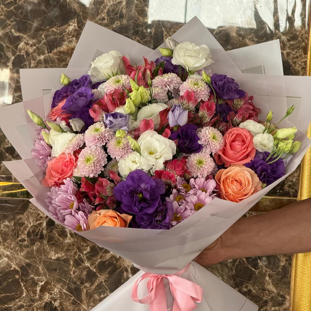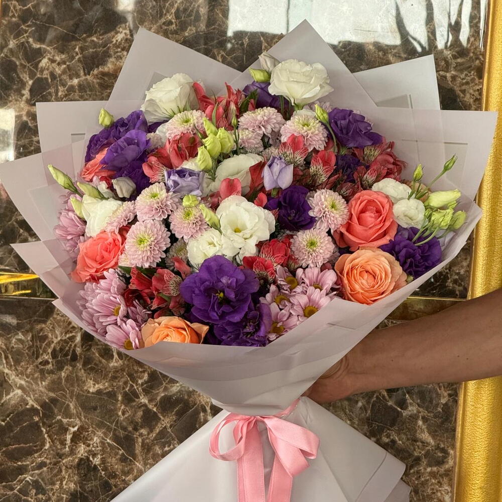 Bu enfes mono buket, 9 adet zarif lisianthus, 7 adet narin gül ve 7 adet şahane krizantemle oluşturulmuştur. Renklerin ve çeşitliliğin mükemmel uyumu, bu buketi herhangi bir özel gün veya sıradan bir günü aydınlatmak için ideal kılacaktır. Taze ve kaliteli çiçeklerle hazırlanan bu buketle, sevdiklerinize ne kadar değerli olduklarını hissettirebilirsiniz.