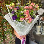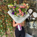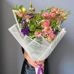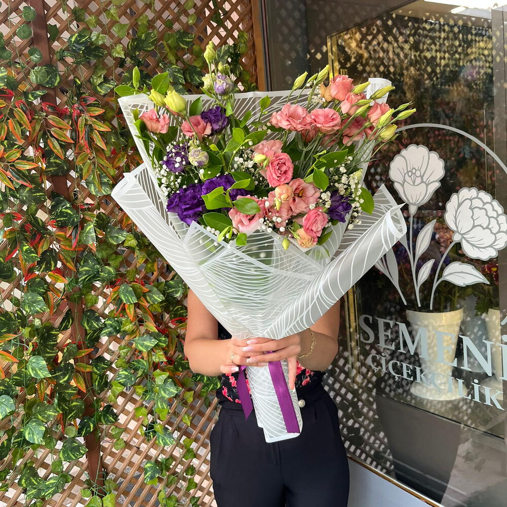 lisianthus pink - 10 adet buket kağıdı - 3 adet lisianthus mor - 10 adet yeşillik - 5 adet cipso - 5 adet cipsofilya - 1 adet