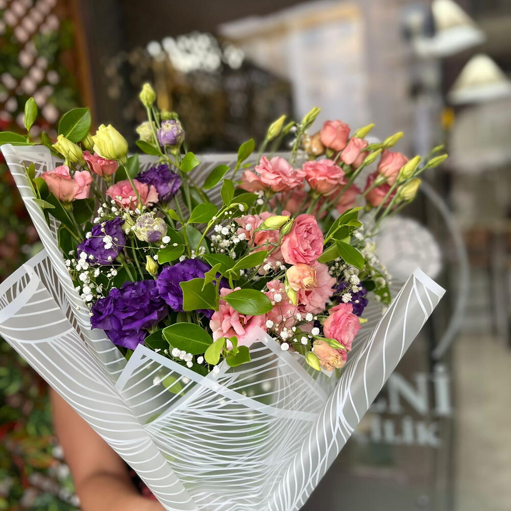 Bu muhteşem Karışık Buket, 15 adet pembe lisianthus, 10 adet mor lisianthus, yeşil yapraklar, 5 adet cipso ve 1 adet cipsofilya ile süslenmiştir. Buğet, her biri zarif bir dokunuş katan 3 adet buket kağıdı ile dikkatlice paketlenmiştir. Bu çarpıcı çiçek aranjmanı, her ortama canlılık ve renk katmak için harika bir seçimdir. Hem özel etkinliklerde hem de günlük yaşamda mükemmel bir dekorasyon birimi olarak tercih edebilirsiniz. Bu karışık buket, doğanın en iyi sunumlarını bir araya getirerek, kişisel bir hediye veya çarpıcı bir centerpiece olarak harika seçimdir.