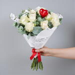 beyaz gül - 9 adet okaliptus - 12 adet dekoratif kalp aksesuarı - 1 adet