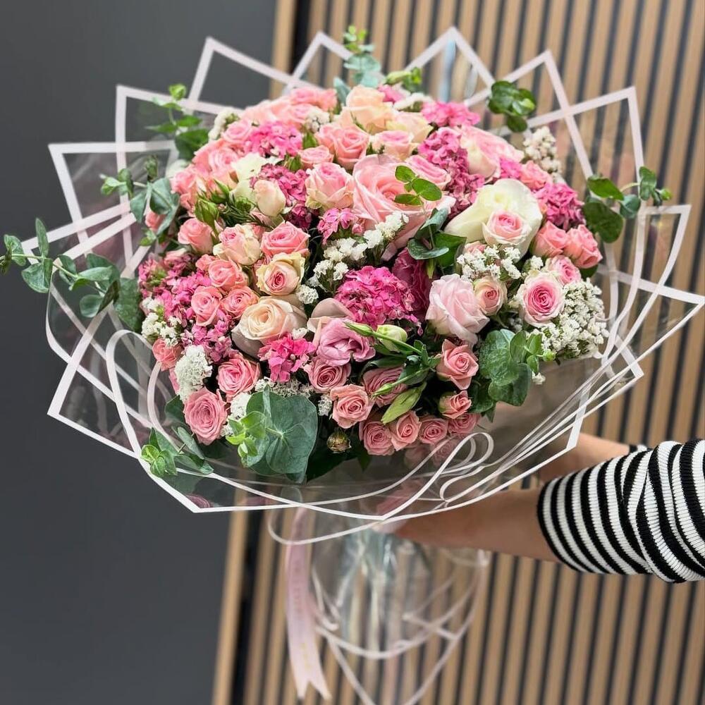 okaliptüs - 10 adet pembe gül - 10 adet beyaz gül - 10 adet lisyantus pembe - 10 adet statik - 10 adet husnuyusuf cicegi - 20 adet mini pembe gül - 40 adet