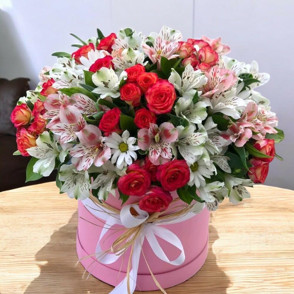 Spray rose - 6 adet Alstroemeria - 20 adet daisy - 10 adet pınk box - 1 adet rıbbon - 1 adet