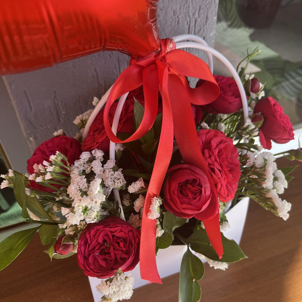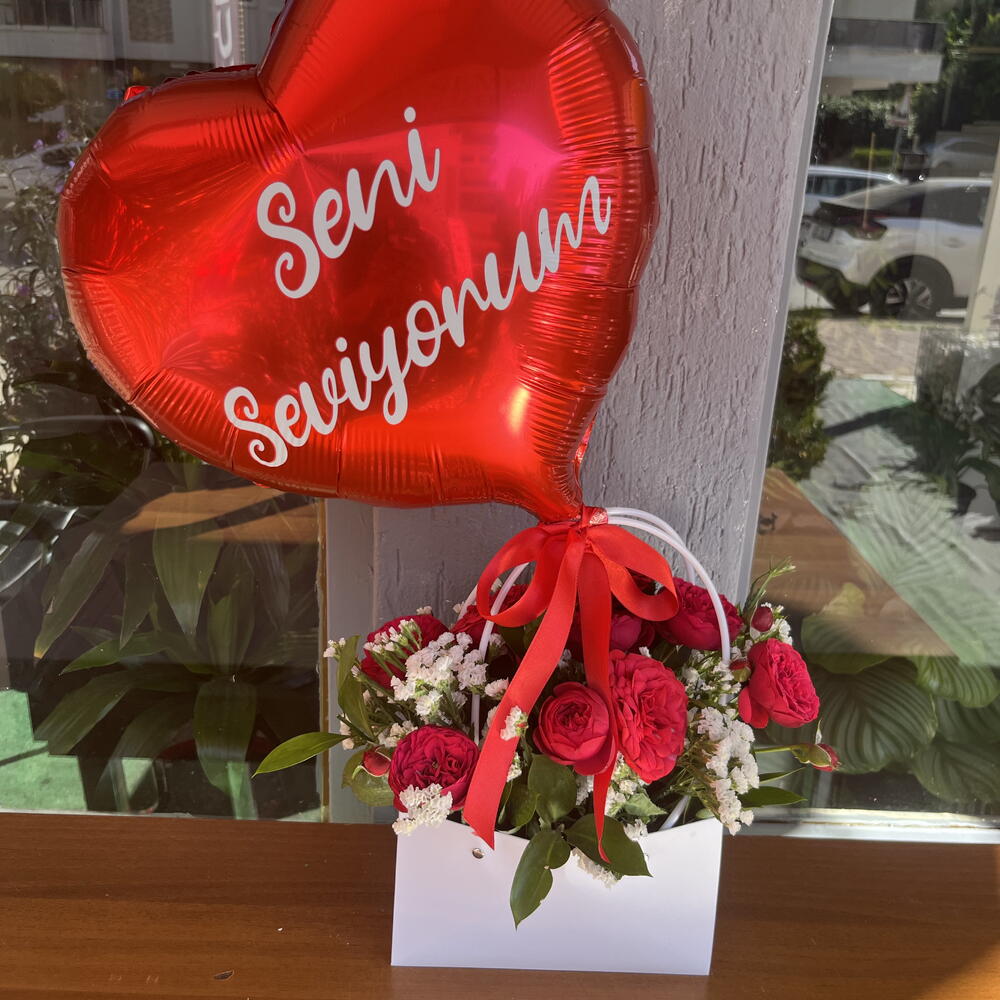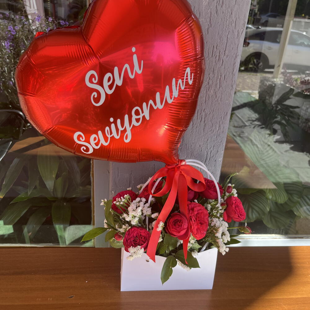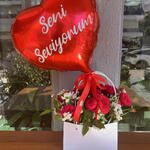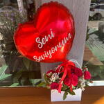Ruscus - 10 adet kutu - 1 adet kırmızı gül - 7 adet seni seviyorum balon - 1 adet kır çiçeği beyaz - 10 adet