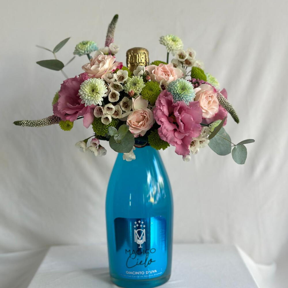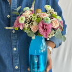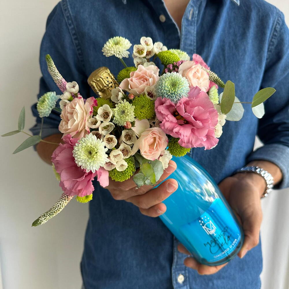 Bu çiçek buketi, alkolsüz bir şampanya, 5 adet krizantem, 2 adet lisyantus ve 3 adet gül içermektedir. Her biri titizlikle seçilen bu çiçekler, sizin ve sevdiklerinizin gününü aydınlatacak. Şampanya dahil edilerek etkinlik veya kutlamalarınızı daha da özel bir hale getiriyor. Bu muhteşem çiçek buketi, hem göz zevkinize hitap edecek, hem de yaşam alanınıza doğal bir güzellik katacaktır.
