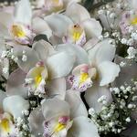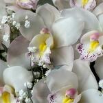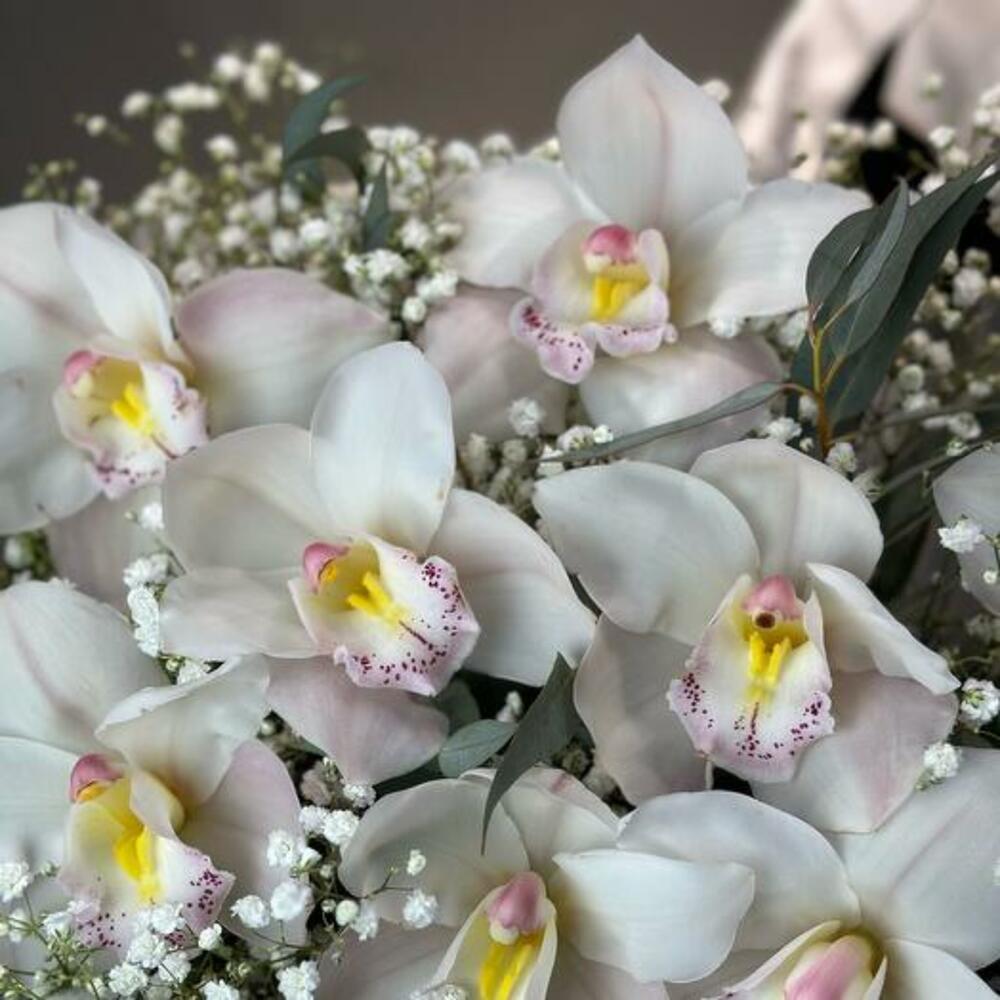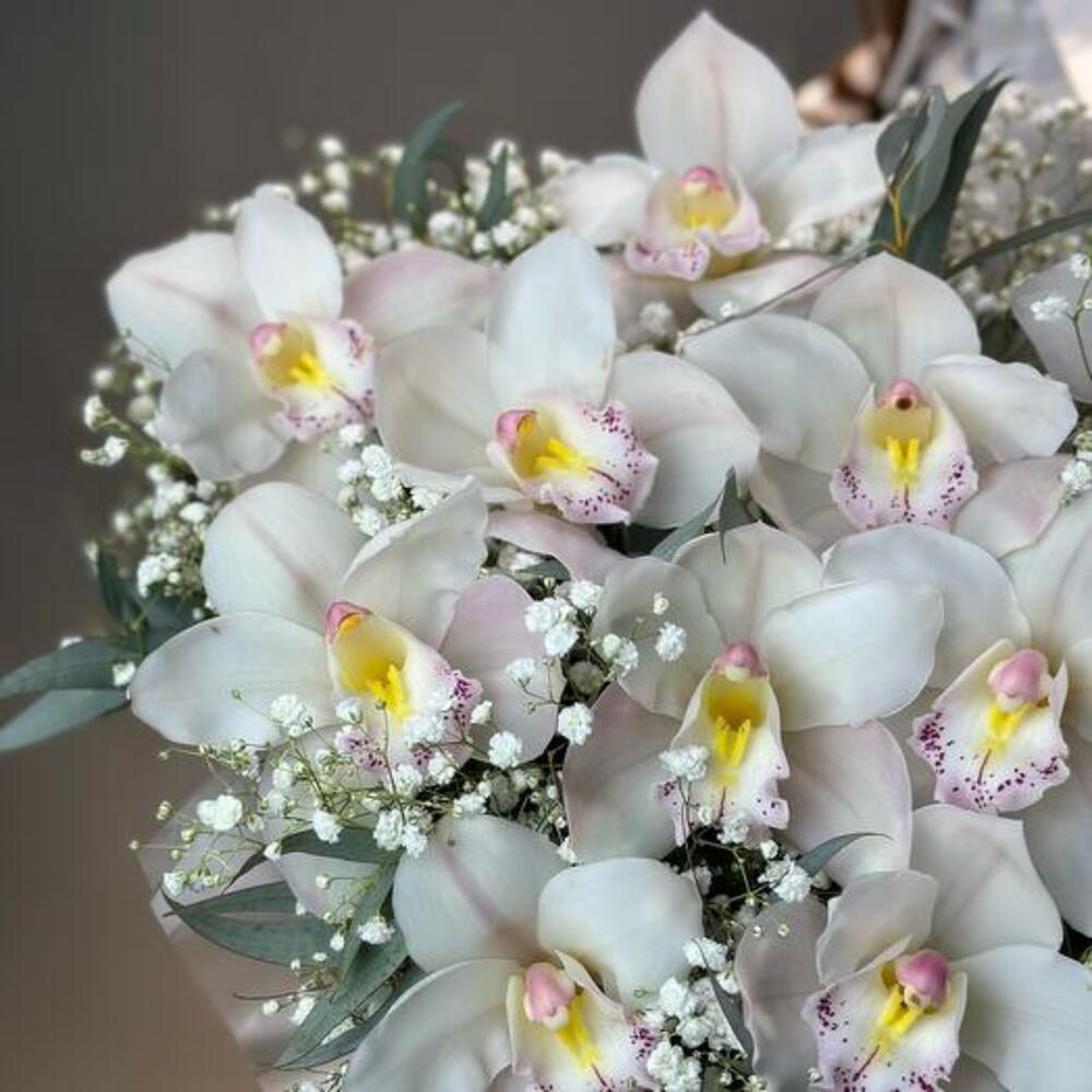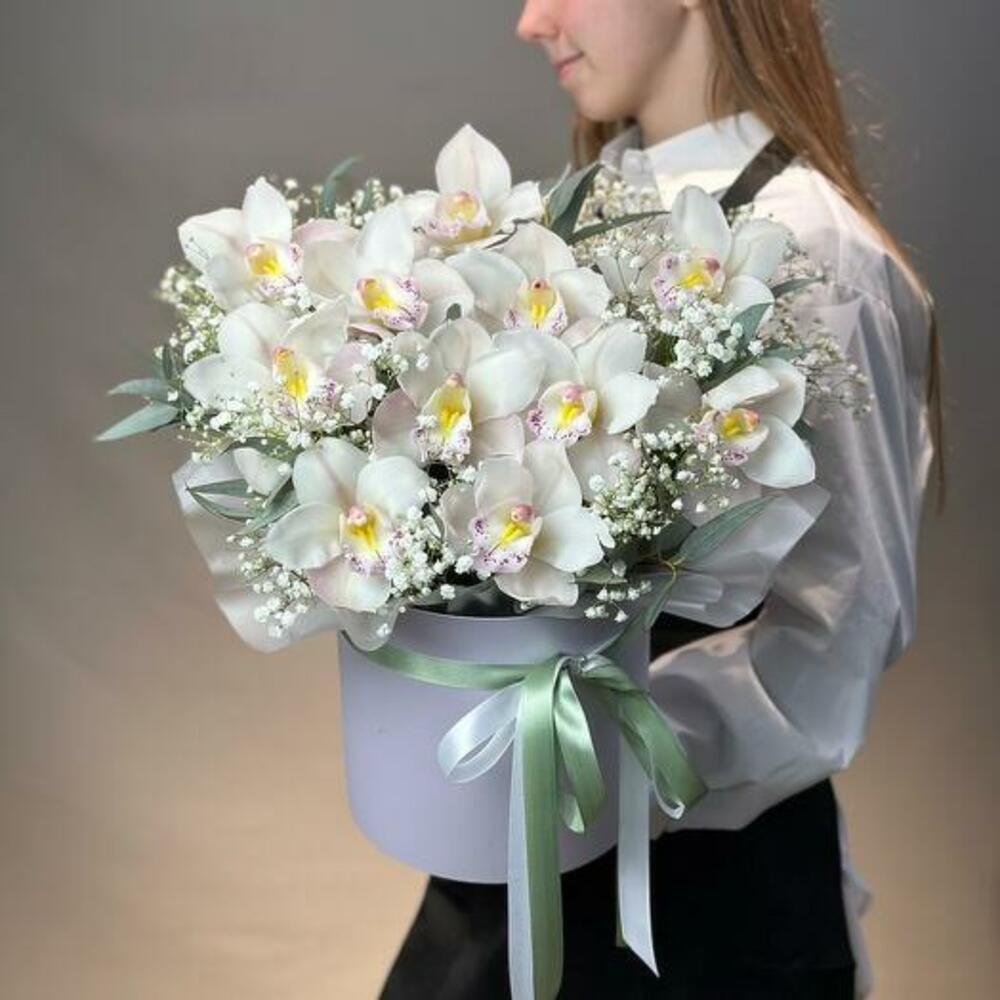 Gypsophila - 5 adet okaliptüs demeti - 1 adet beyaz cymbidium orkide - 11 adet şapka kutusu ve vaha - 1 adet