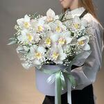 Bu zengin aranjman, narin gypsophila çiçekleri arasına yerleştirilmiş, saflığı ve zarafeti simgeleyen çarpıcı bir beyaz orkide içeriyor. Yemyeşil bir şapka kutusu içinde sunulan bu buket, sofistike ve cazibeli bir görünüm sergiliyor. Düğünler veya yıldönümleri gibi özel anları kutlamak ya da sadece mekanınıza zarafet katmak için mükemmel olan bu şapka kutusu aranjmanı, güzelliğin ve zarafetin zamansız bir ifadesidir.