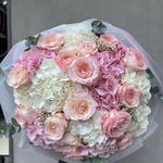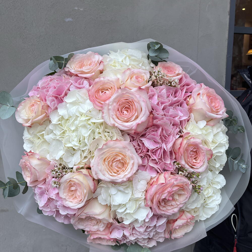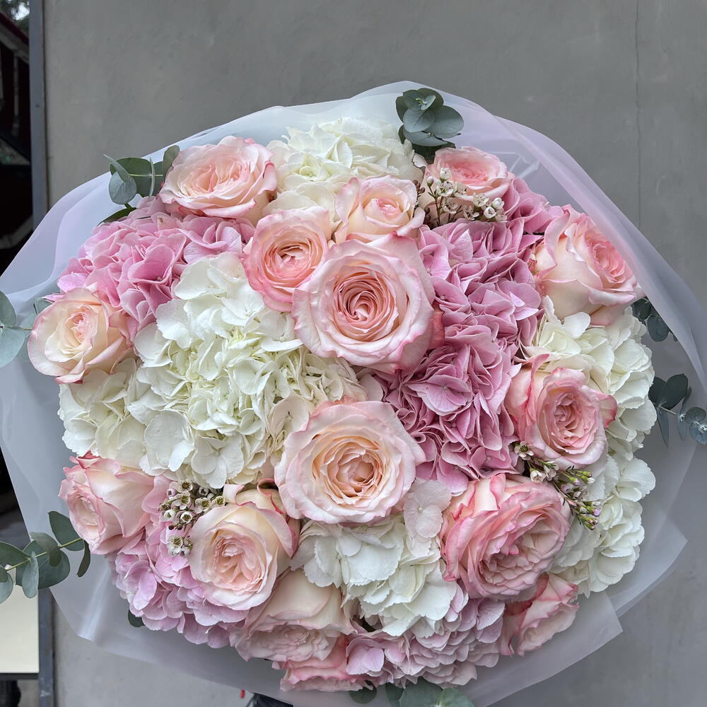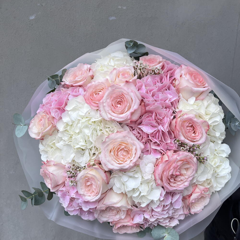 Bu karışık buket, romantizmi ve sofistike zarafeti bir arada sunan mükemmel bir hediye. Bu büyüleyici buket, 11 adet ithal pembe gul ve 15 adet okaliptüs içerir, hepsinin merkezinde ise nihai dokunuş olarak bir adet hidrangea kullanılmıştır. Çiçeklerin taze, canlı renkleri bir anlık neşe ve kalıcı bir izlenim yaratır. Tüm özel anlarınızı kutlamak için ideal olan bu duygu dolu buket, sevdiklerinizin yüzünde unutulmaz bir gülümseme yaratmak için bire bir.