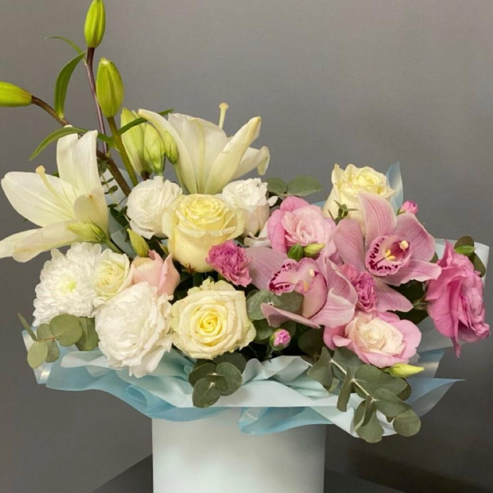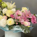 🌸 Luxury Orchid Lily Box 🌸 (Premium – Otel VIP segment) 💐 İçerik (çok güçlü): • Beyaz lilyum (ithal) – 1 dal (tomurcuklu) • Pembe orkide (cymbidium) – 2 dal • İthal beyaz gül – 4–5 adet • Beyaz lisyantus / karanfil premium • Eucalyptus (ithal) • Özel renkli premium kâğıt + silindir kutu ⚠️ Lilyum + orkide aynı aranjmanda varsa bu zaten otomatik olarak luxury class olur. ⸻ 📏 Ölçü Duruş: • Genişlik: 35–40 cm • Yükseklik: 40–45 cm