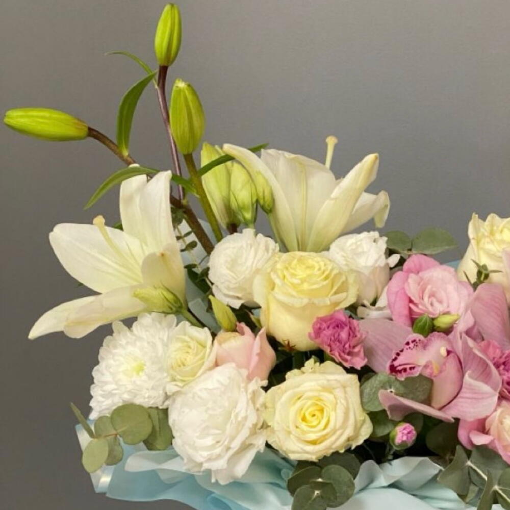 i̇thal gül - 6 adet beyaz lisyantus - 4 adet pembe karanfil - 9 adet beyaz kasımpatı (chrysanthemum) - 9 adet beyaz lilyum (ithal) - 2 adet pembe orkide (cymbidium) - 2 adet