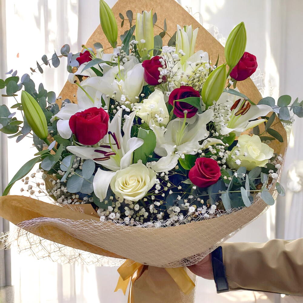 Lilium - 7 adet dekoratif yeşillik - 1 adet kırmızı gül - 5 adet beyaz gül - 3 adet