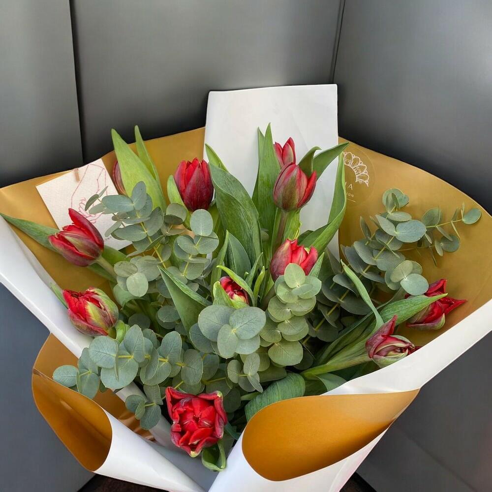 MAIA NO4, zarafeti ve doğallığı bir araya getiren sade ama göz alıcı bir mono bukettir. 10 adet ithal kırmızı lale ile hazırlanan bu buket, tazeliğin ve sevginin en zarif halini yansıtır. Bukete eşlik eden 1 demet okaliptus ise hem görsel hem de aromatik açıdan kompozisyona doğallık ve ferahlık katar. Doğum günü, Sevgililer Günü, yıl dönümü ya da sadece “seni düşünüyorum” demek için mükemmel bir tercihtir. Her bir çiçek özenle seçilmiş olup, buket ustalıkla sarılmıştır. Bakım Tavsiyesi: Çiçeklerinizi serin bir ortamda muhafaza edin ve doğrudan güneş ışığına maruz bırakmamaya özen gösterin. Suya yerleştirdiğinizde her gün suyunu tazeleyin ve saplarını hafifçe kesin. Böylece çiçeklerinizin canlılığı daha uzun süre korunur.
