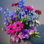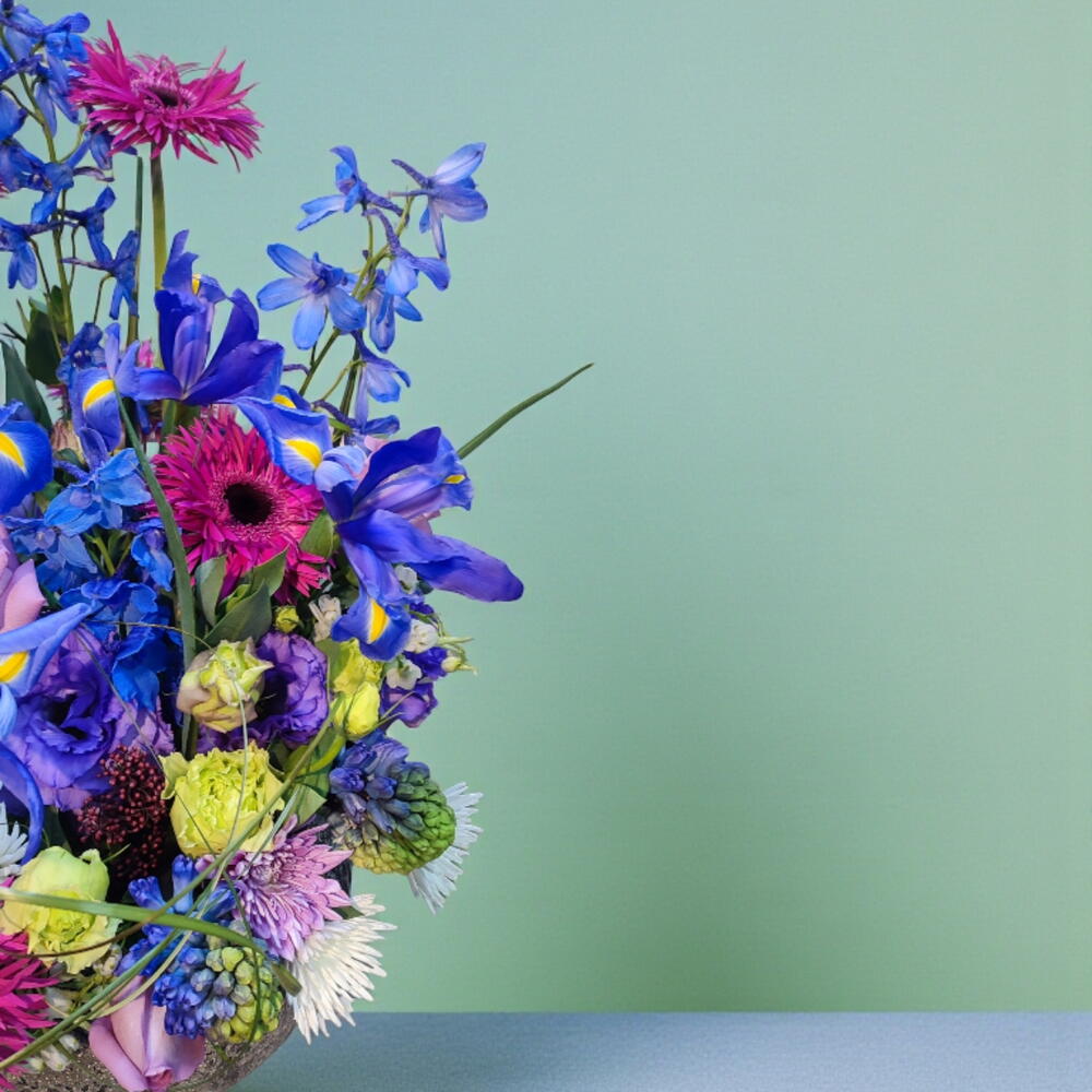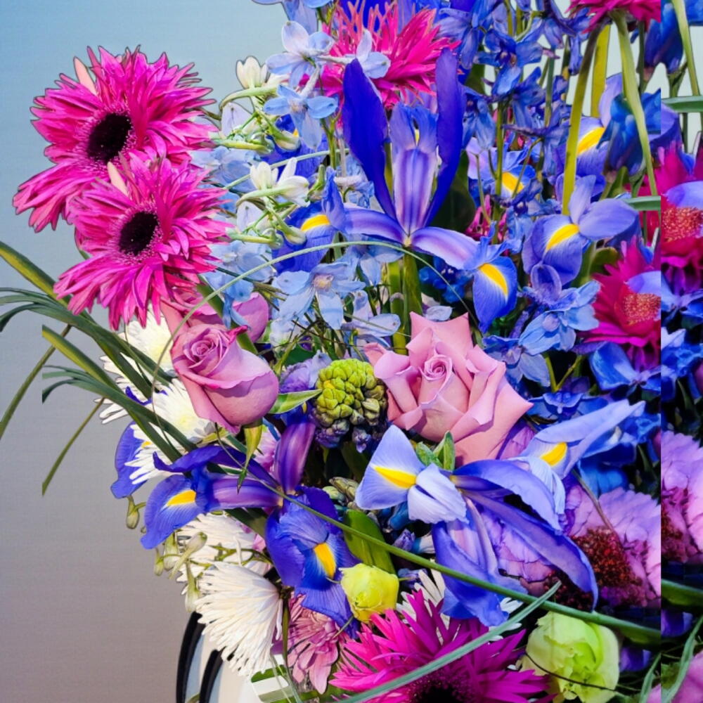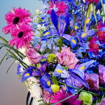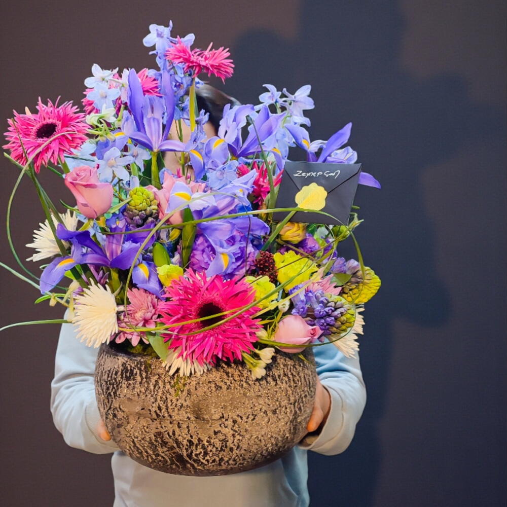 Lisianthus - 5 adet krizantem - 9 adet yeşil yapraklar - 9 adet i̇ris - 7 adet mavi delphinium - 5 adet lila gül ithal - 5 adet gerbera pink ithal - 5 adet