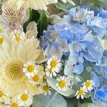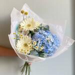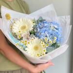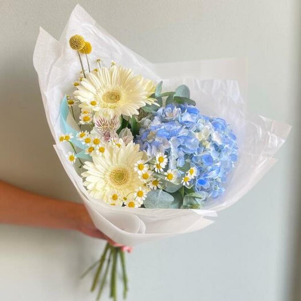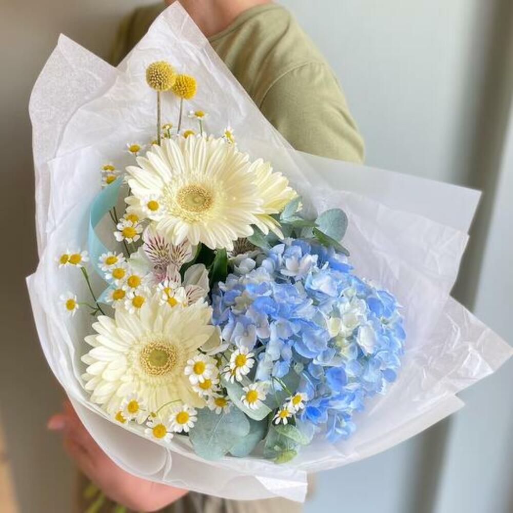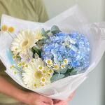 Mavi ortanca ve beyaz gerberalardan oluşan buket