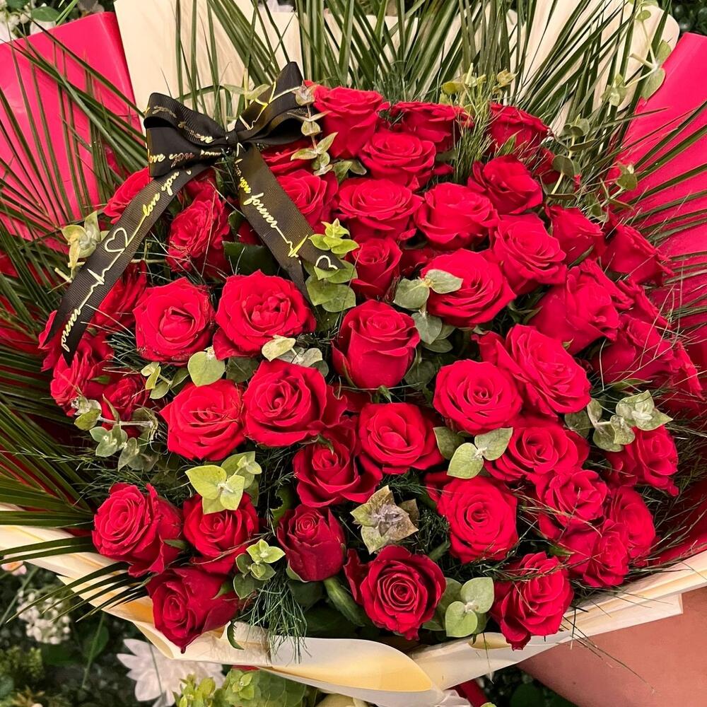 virgatus - 50 adet kırmızı gül - 51 adet beyaz gül - 1 adet okaliptus - 30 adet fenix yaprak - 5 adet