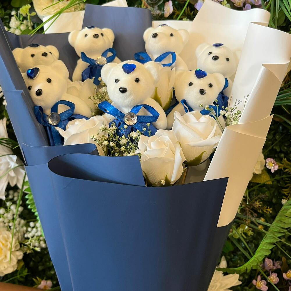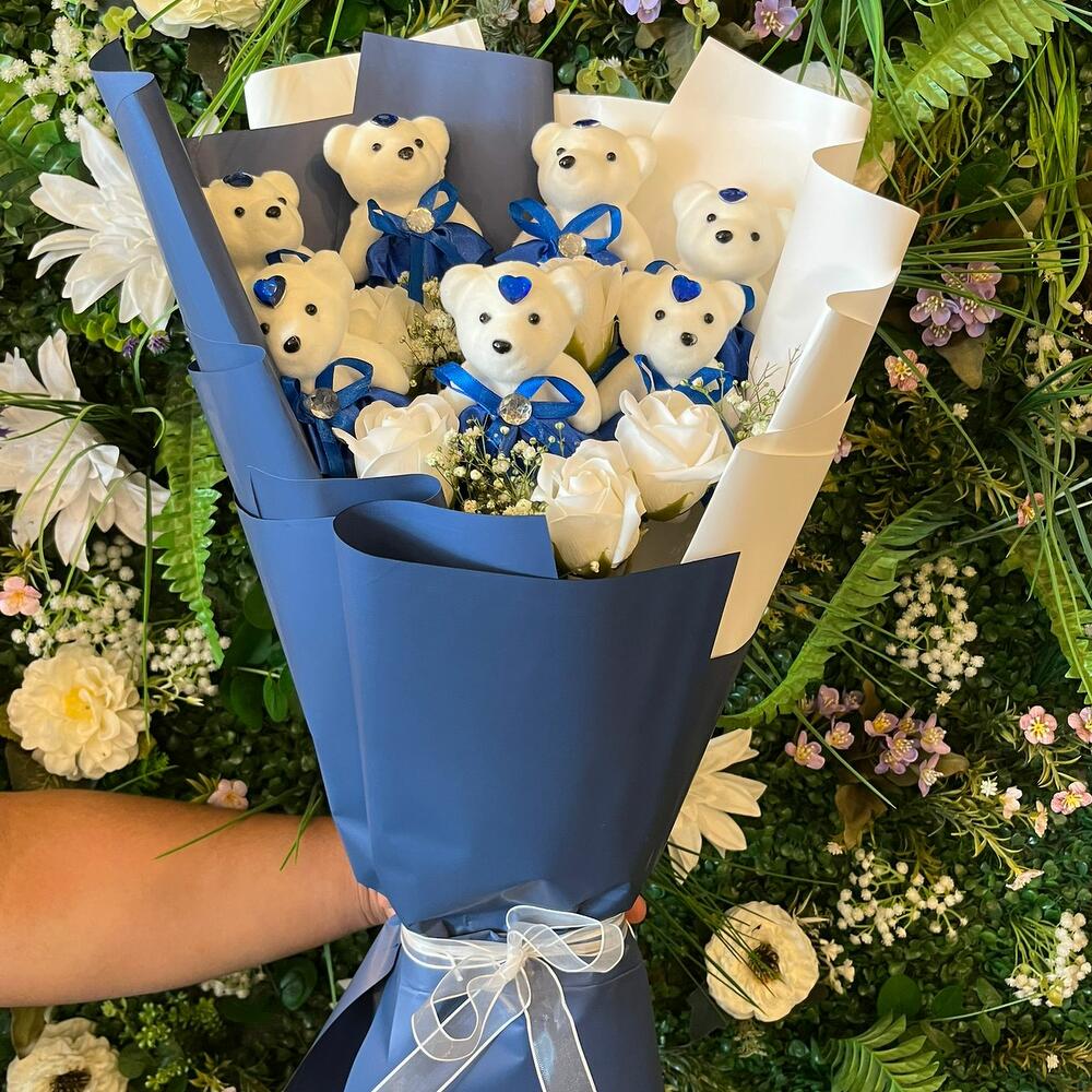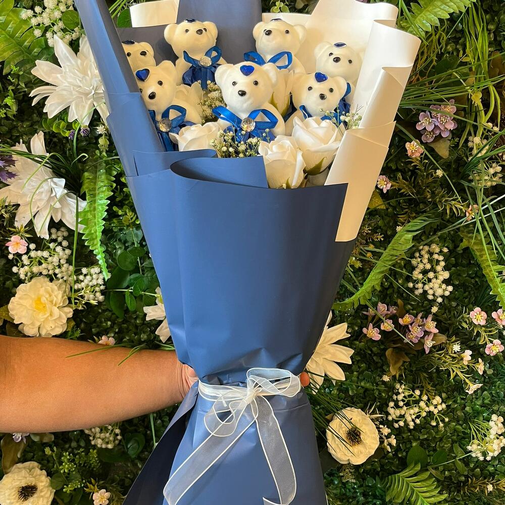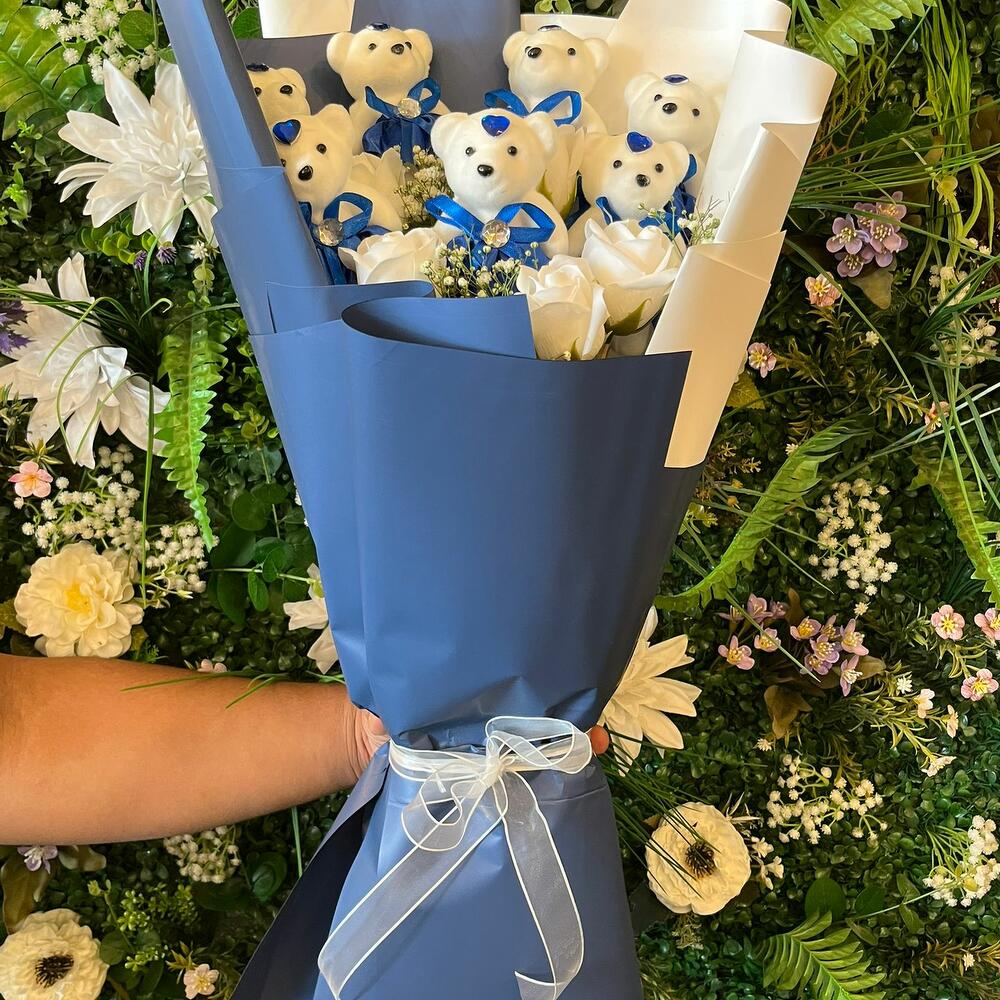 MEGA BOY BEYAZ GÜLLÜ MAVİ AYICIK BUKETİ