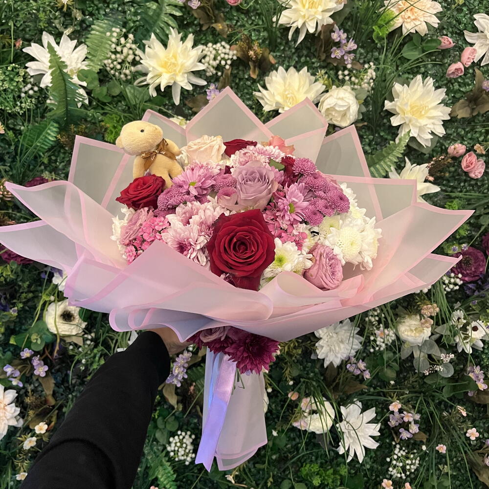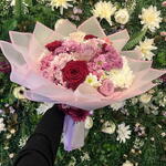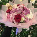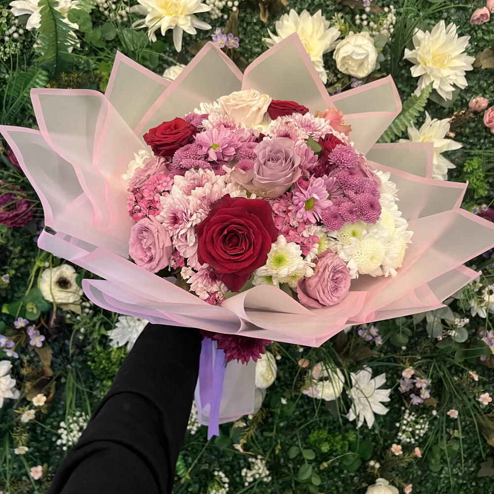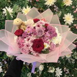 kırmızı gül - 6 adet pembe papatya - 10 adet lila gül - 7 adet hüsnü yusuf - 8 adet kasımpatı - 30 adet