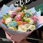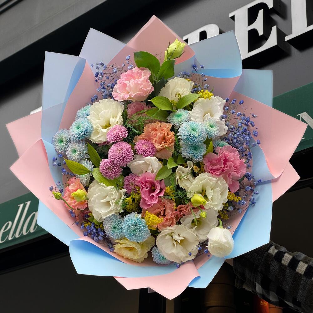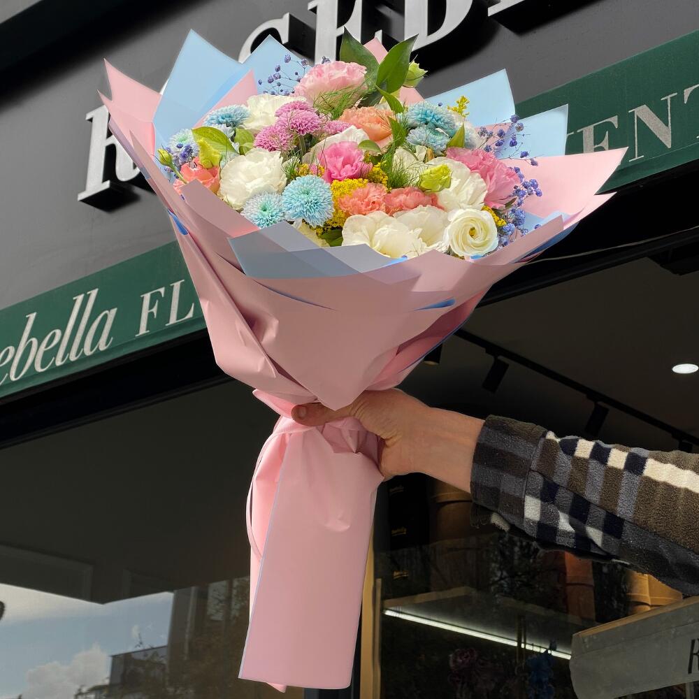 Bu özel tasarım aranjman, 7 adet beyaz ve 7 adet pembe lisyantus, 3 adet mavi krizantem ve 1 adet pembe krizantemden oluşuyor. Farklı renk ve çiçekler, bu düzenlemeyi ilginç ve şık hale getiriyor. İster misafirlerinizi ağırlayın, isterse günlük hayatınıza bahar rengi katabileceğiniz mükemmel bir seçenektir.