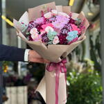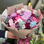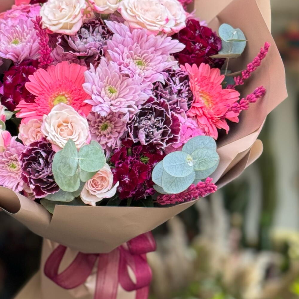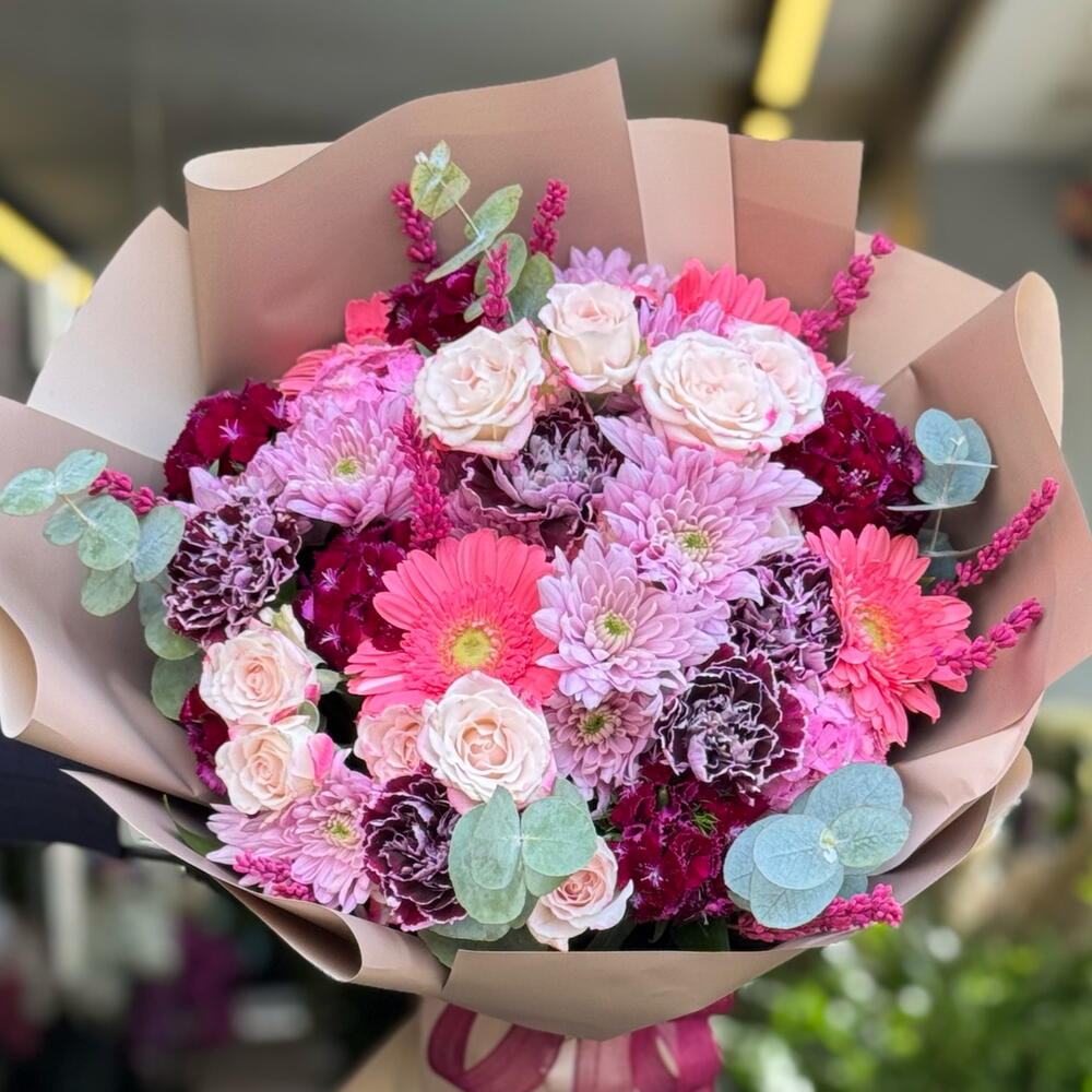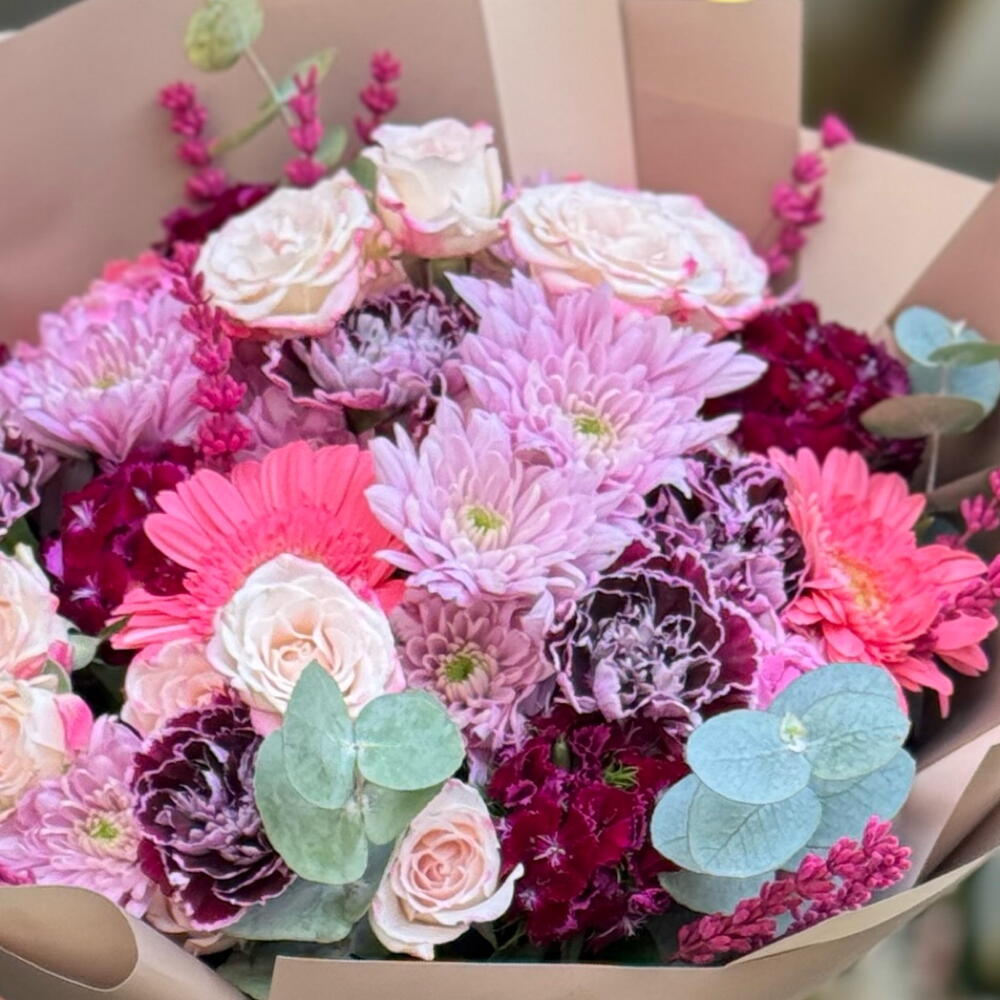 Pembe ve morun büyüleyici uyumundan doğan bu özel buket; zarafeti, romantizmi ve inceliği aynı anda hissettiren eşsiz bir tasarım. Pastel pembe güllerin yumuşak dokunuşu, canlı gerberaların enerjisi ve mor krizantemlerin asil tonlarıyla zenginleştirilen bu aranjman; her bakışta farklı bir güzellik sunuyor. Modern kahve kâğıdı ve bordo kurdele detayıyla hem şık hem de kusursuz bir hediye hâline geliyor. Sevdiğiniz kişiye “Sen benim için özelsin” demenin en zarif yolu bu buket… Doğum günleri, yıl dönümleri, sürprizler ve romantik anlar için kusursuz bir tercih.