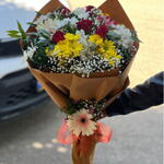Gerbera - 2 adet kırmızı gül - 5 adet beyaz papatya - 15 adet yeşillik - 8 adet sarı papatya - 8 adet cipso - 8 adet