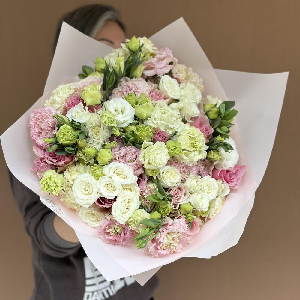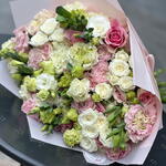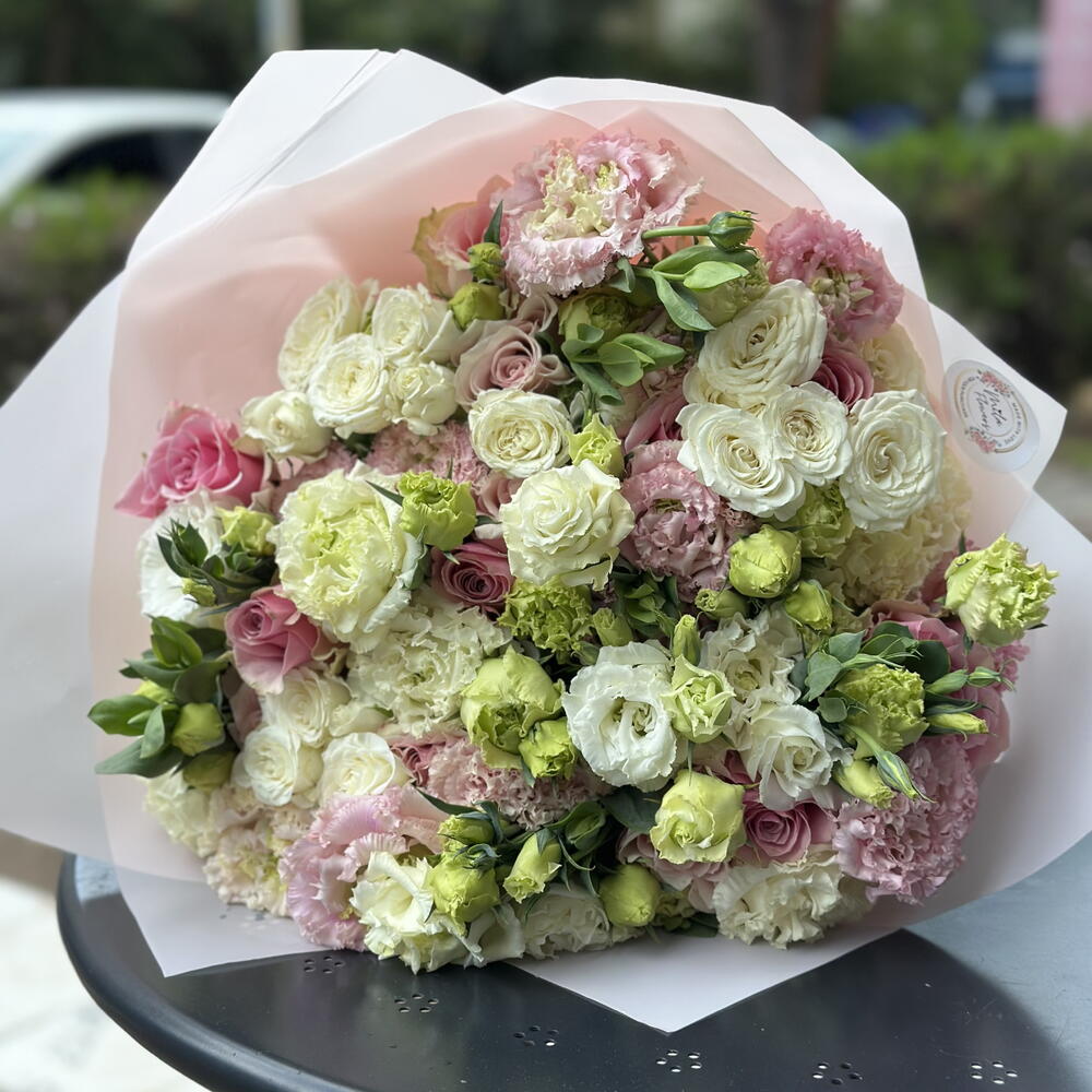packaging - 6 adet sprey rose - 7 adet pembe gül - 7 adet kurdela - 3 adet beyaz lisianthus - 11 adet pembe lisianthus - 11 adet acık pembe gül - 7 adet